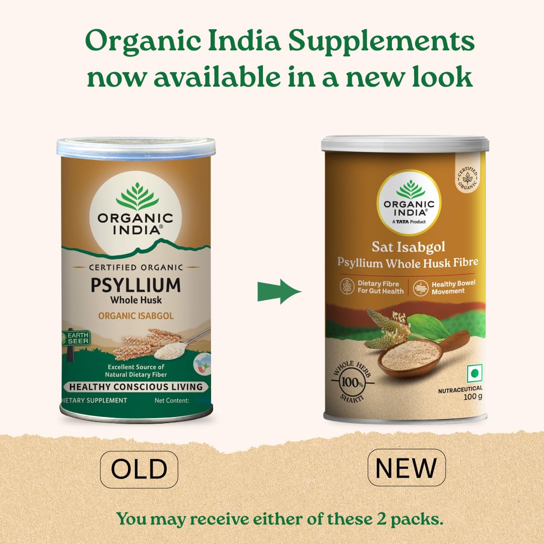 A TATA Product - Organic India Sat Isabgol Psyllium Whole Husk Powder - 100g, With Dietary Fiber, Supports Heart Health & Digestive System, Gluten Free, Non-GMO Project Verified, NPOP & USDA Certified