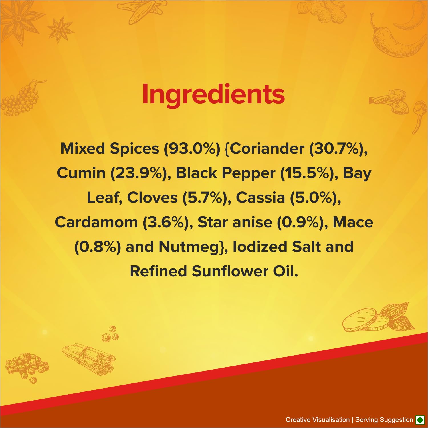 Mixed Spices (93.0%) (Coriander (30.7%), Cumin (23.9%), Black Pepper (15.5%), Bay Leaf, Cloves (5.7%), Cassia (5.0%), Cardamom (3.6%), Star anise (0.9%), Mace (0.8%) and Nutmeg}, lodized Salt and Refined Sunflower Oil.