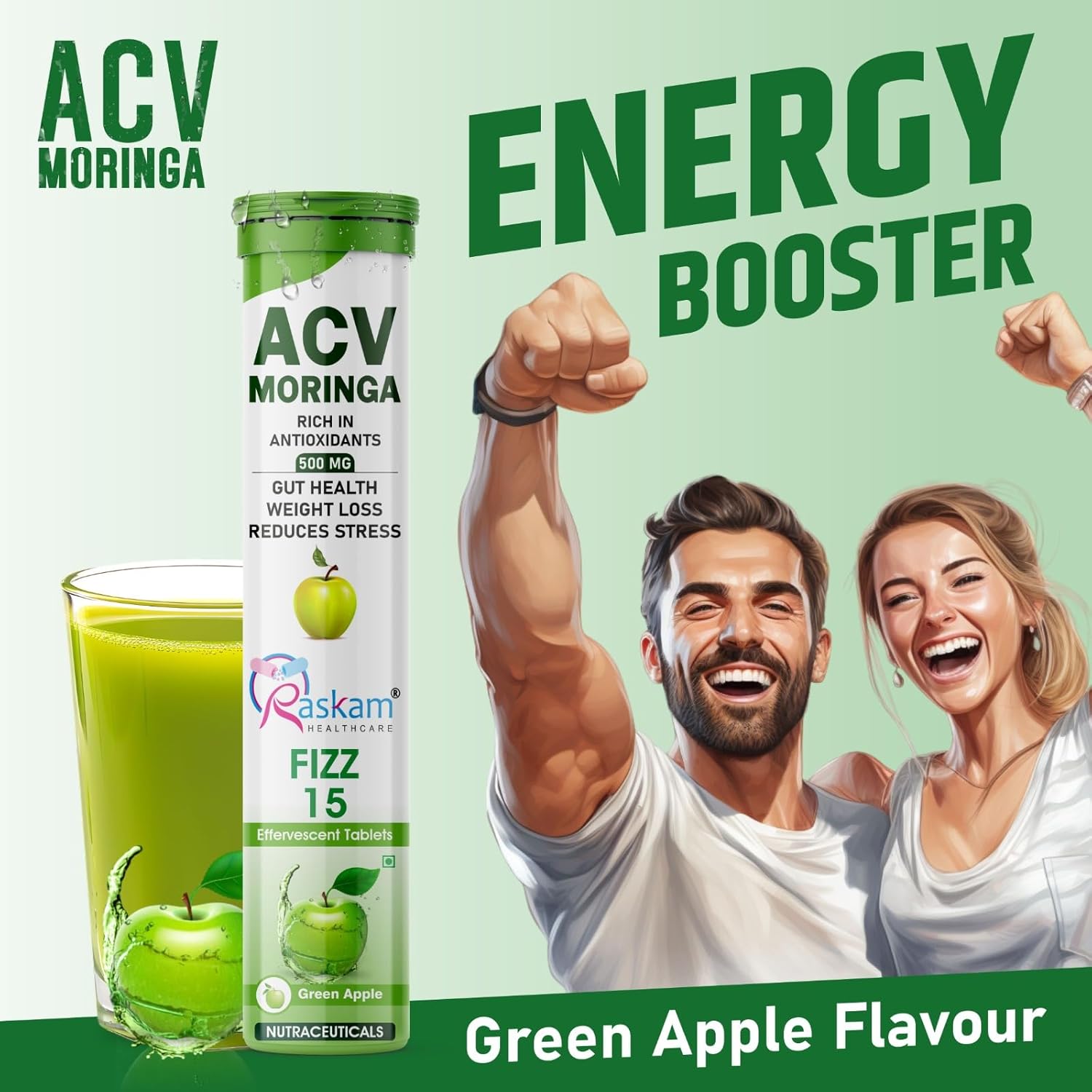 ACV Moringa Effervescent Tablets | Fizz 15 Tablets in Green Apple Flavor, 500mg| Natural Energy & Immunity Booster with Antioxidants to Control Cravings (Pack of 1)