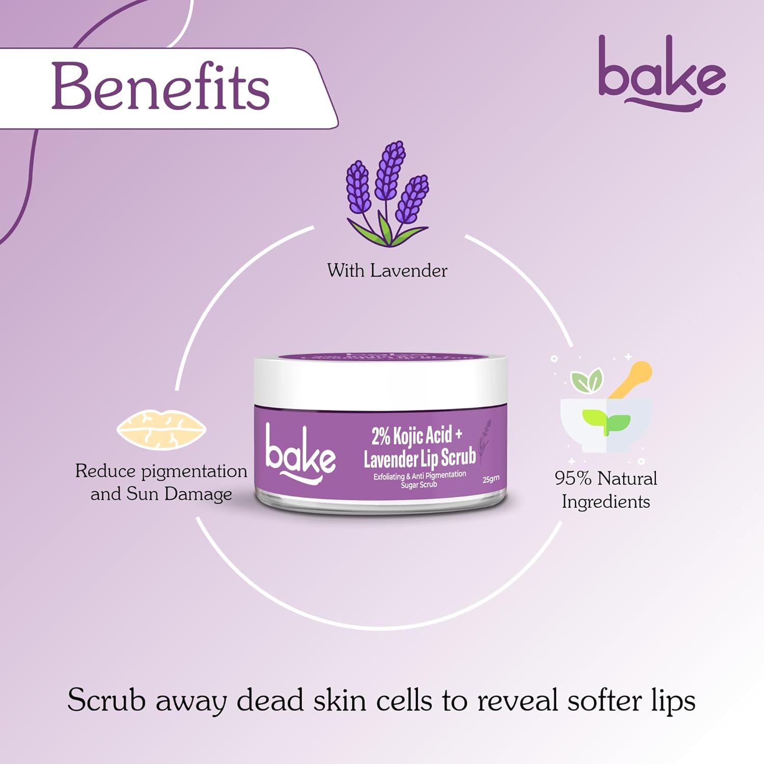 BAKE 2% Kojic Acid Lavender Lip Scrub for Dark, Pigmented Lips with Sugar Granules for Dry & Pink Lips, For Men & Women - 25g