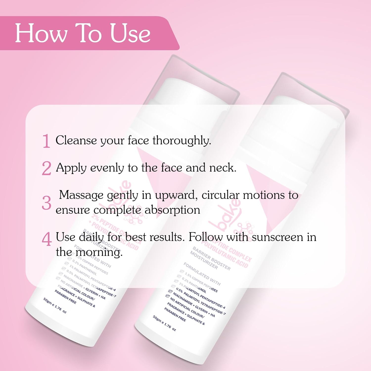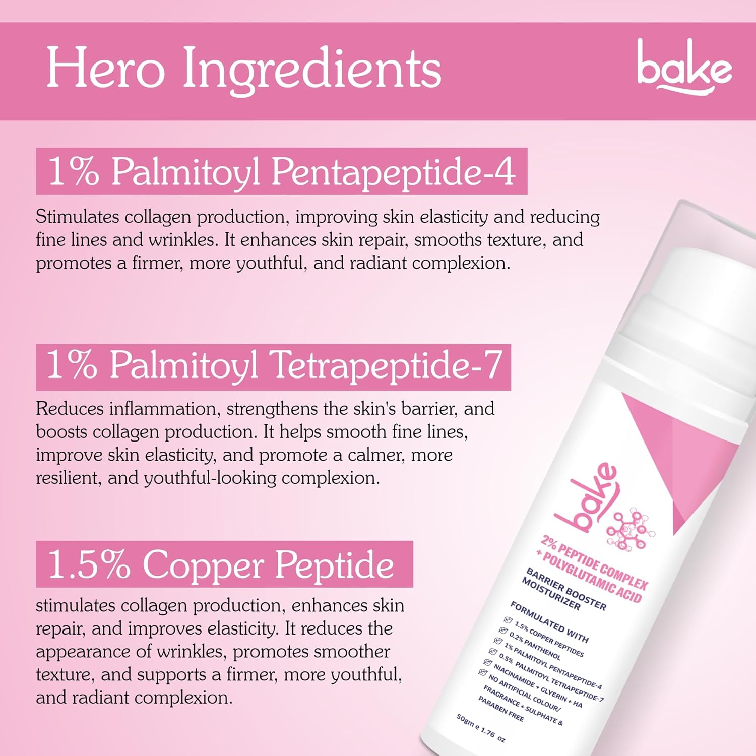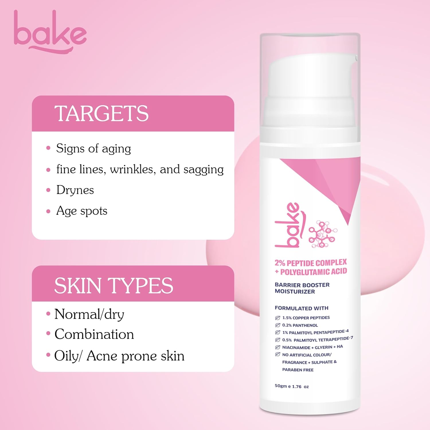 BAKE 2% Peptide Complex Moisturizer with Polyglutamic Acid, 1.5% Copper Peptides, Niacinamide for Barrier Repair & Strengthening | Non Comedogenic, For Oily, Normal & Sensitive Skin - 50g