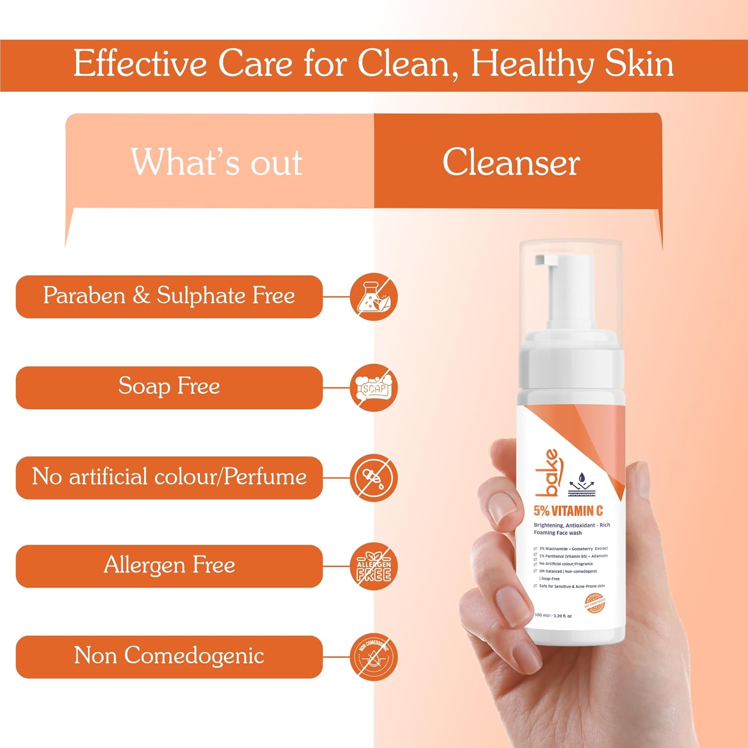 BAKE 5% Vitamin C Foaming Face Wash with Niacinamide | Brightening Face Wash for Pigmentation, Dark Spots & Uneven Skin Tone | Antioxidant Rich Cleanser for Dull, Normal to Oily Skin – 100ml