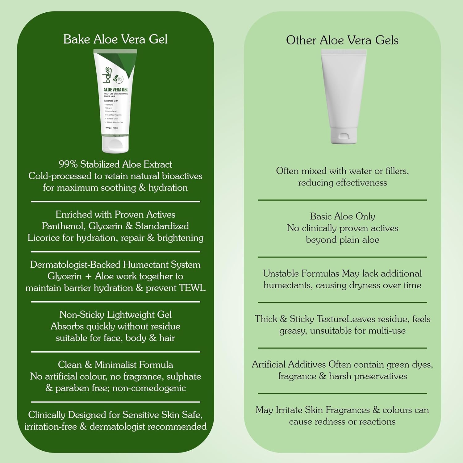 BAKE 99% Pure Aloe Vera Gel (200g) For Face, Body & Hair With Panthenol & Glycerin | Hydrates Skin, Reduces Dryness & Non Sticky | Enriched Proven Actives | For Men & Women - 200g