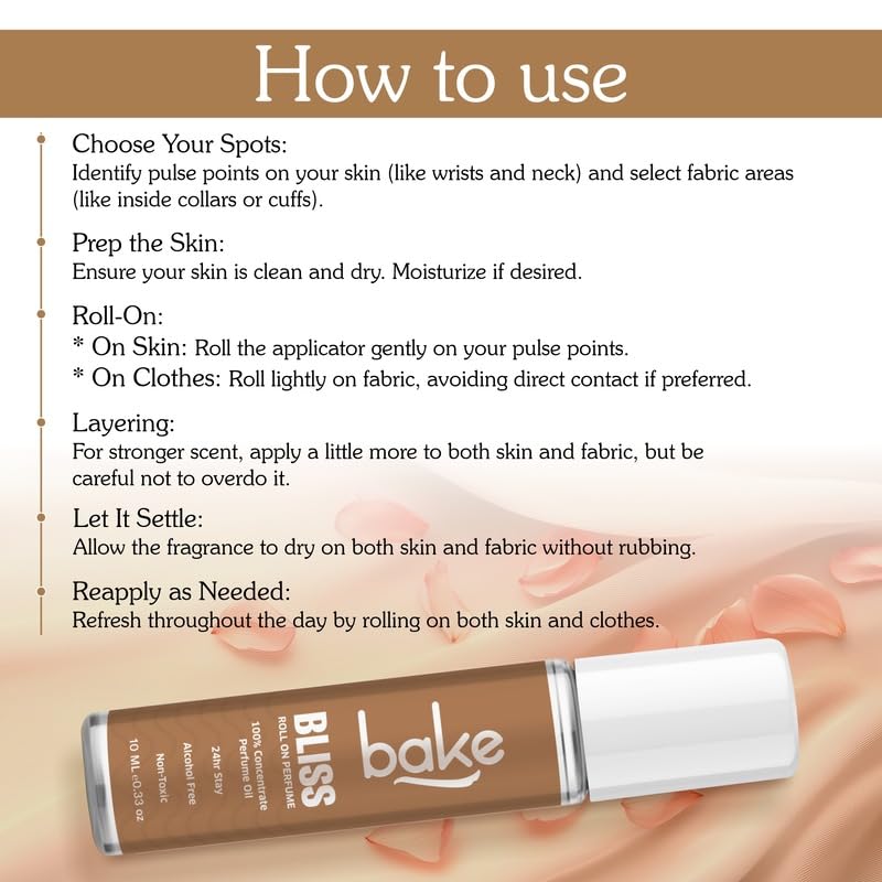 1.) Choose Your Spots – Apply the perfume on pulse points like the wrists, neck, and behind the ears. You can also roll it on fabric areas like the inside of collars or cuffs for a lasting scent. 2.) Prep the Skin – Ensure your skin is clean and dry before applying. Moisturizing beforehand can help the fragrance last longer. 3.) On Skin: Gently roll the applicator on your pulse points for direct absorption. 4.) On Clothes: Lightly roll on fabric, avoiding direct contact if preferred. 5.) Let It Settle – Allow the fragrance to dry naturally on the skin and fabric without rubbing.