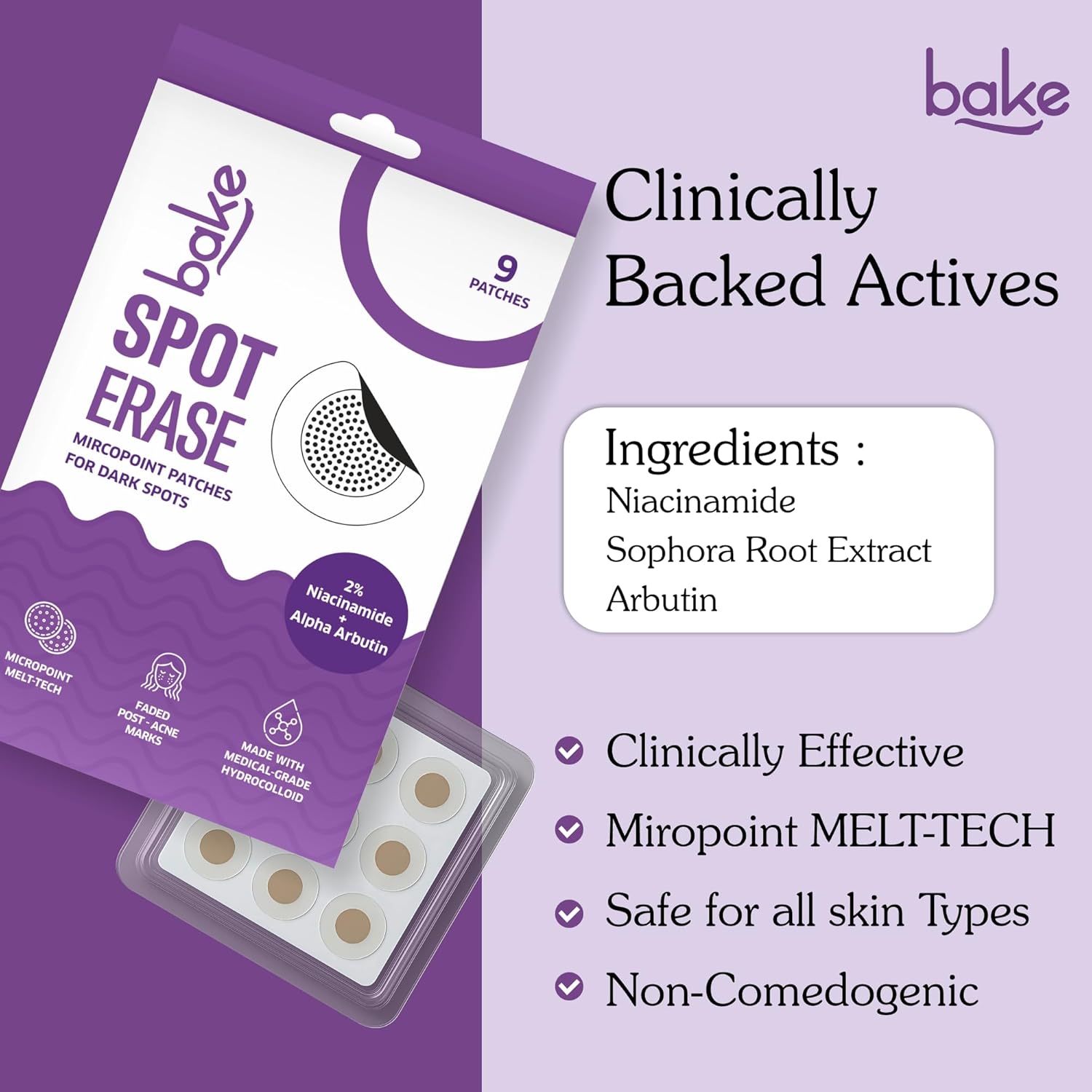 BAKE Spot Erase Micropoint Patches are advanced skincare solutions formulated to target post-acne dark spots, hyperpigmentation, and uneven skin tone. Powered by 176 precision-engineered melt-tech microneedles, each patch delivers active ingredients directly into the skin’s surface for enhanced efficacy. Formulated with 2% Niacinamide, Kojic Acid, and Alpha Arbutin, this potent blend helps inhibit melanin production, reduce the appearance of pigmentation, and brighten the skin over time. The microneedles painlessly dissolve upon contact with skin moisture, ensuring optimal absorption without irritation or downtime. Ideal for spot correction, these patches are particularly effective on lingering acne marks and stubborn dark spots. The lightweight, transparent format adheres seamlessly to the skin, making it suitable for use under makeup or as part of your overnight routine. Tested for safety and efficacy, the formulation is free from parabens, sulfates, and added fragrance, making it suitable for all skin types. Each box contains 9 individually packed patches to maintain hygiene and convenience. Whether used occasionally or as part of a consistent regimen, these patches support a visibly clearer and more even-toned complexion. Developed with a focus on targeted skin repair, they are a must-have addition to any advanced skincare routine. Made for both men and women seeking effective, science-backed solutions to post-acne pigmentation.