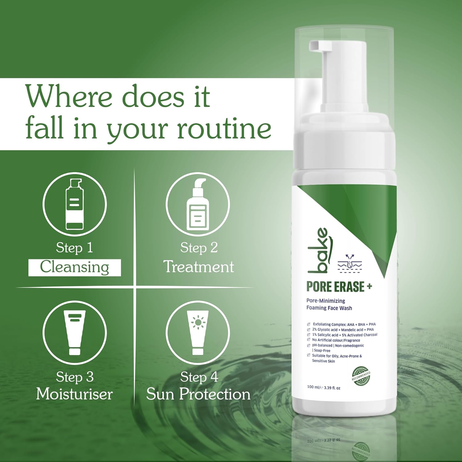 BAKE Pore Erase Foaming Face Wash with 2% Glycolic Acid, 1% Salicylic Acid & Mandelic Acid | Unclogs Pores, Reduces Blackheads & Whiteheads, Controls Sebum | For Oily, Acne Prone & Combination Skin – 100ml