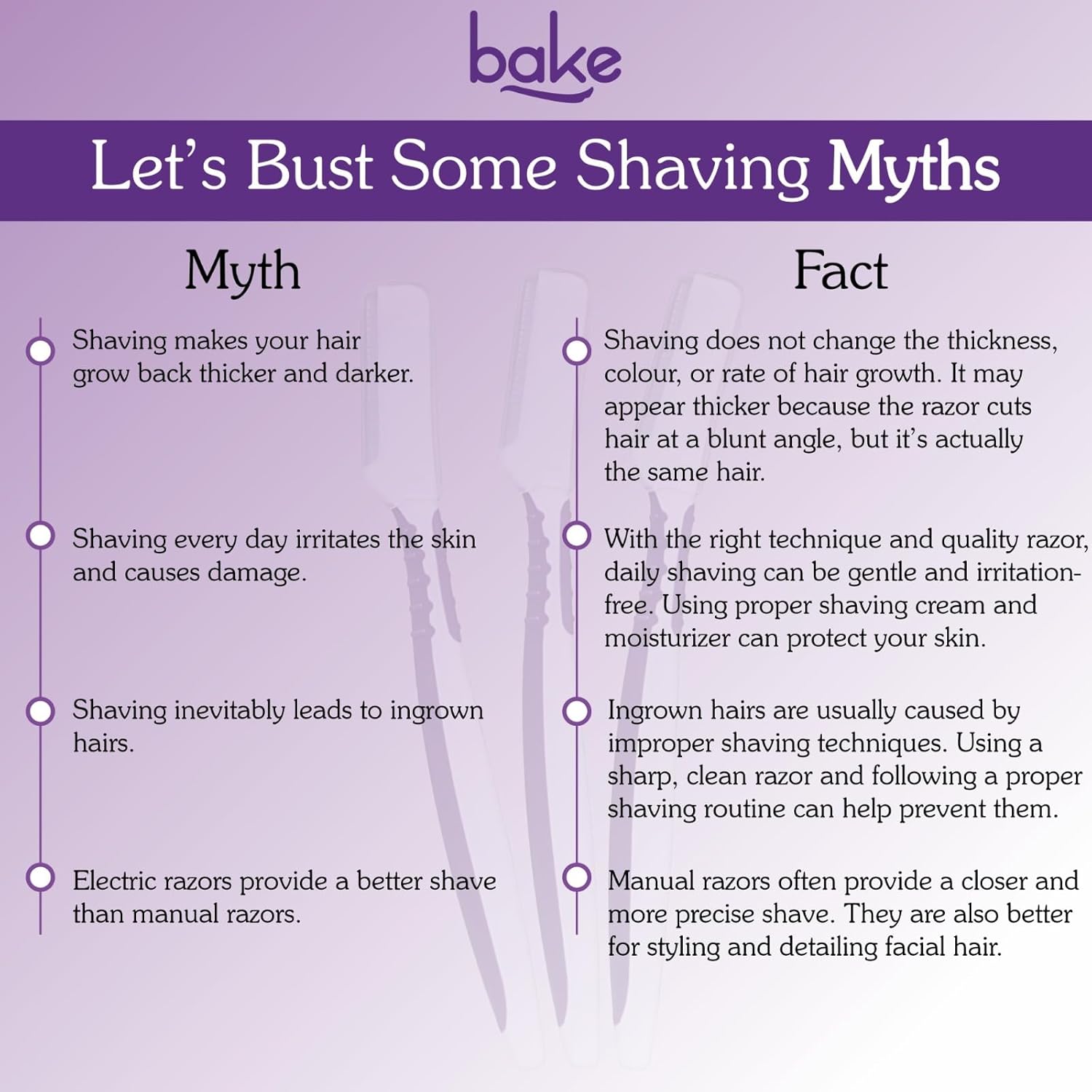 - PAINLESS HAIR REMOVAL : BAKE Reusable Face Razor features precision blades that gently and efficiently remove facial hair, minimizing irritation and discomfort for a painless hair removal experience.