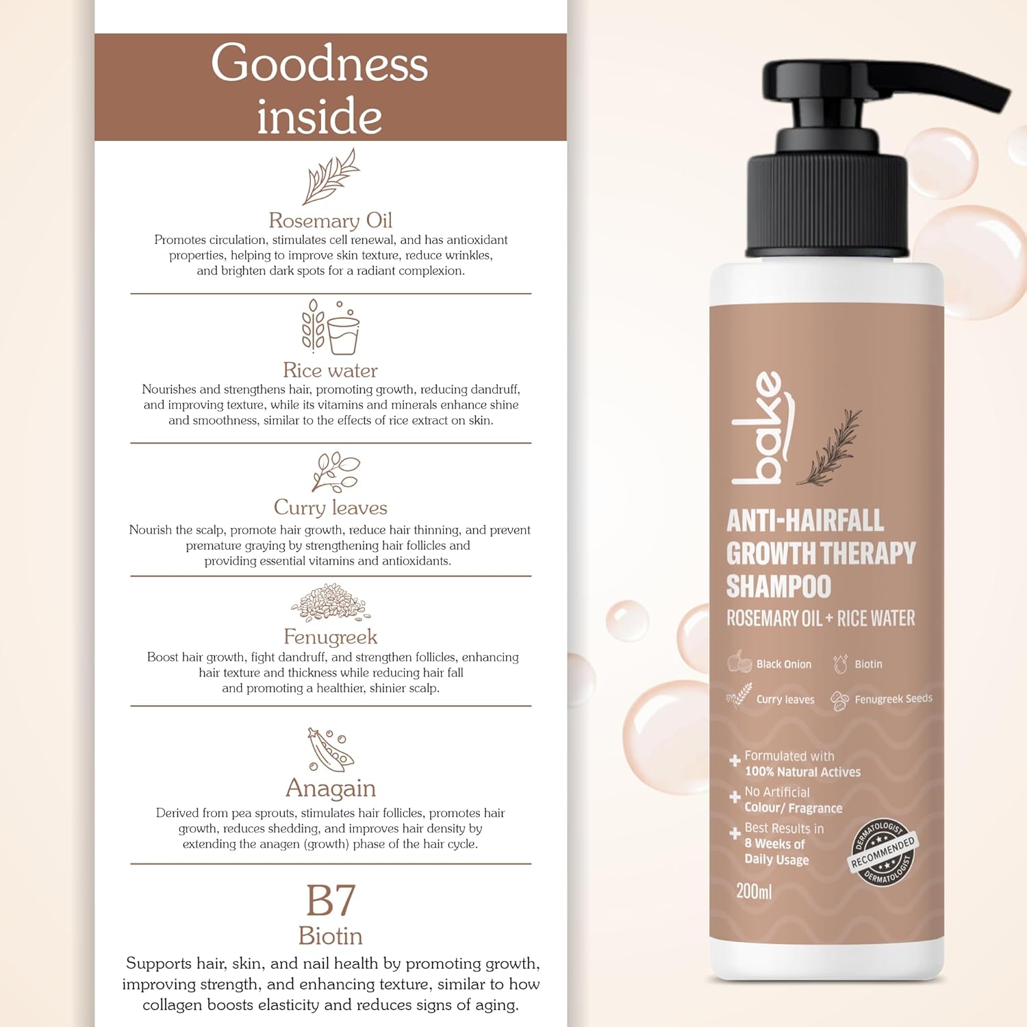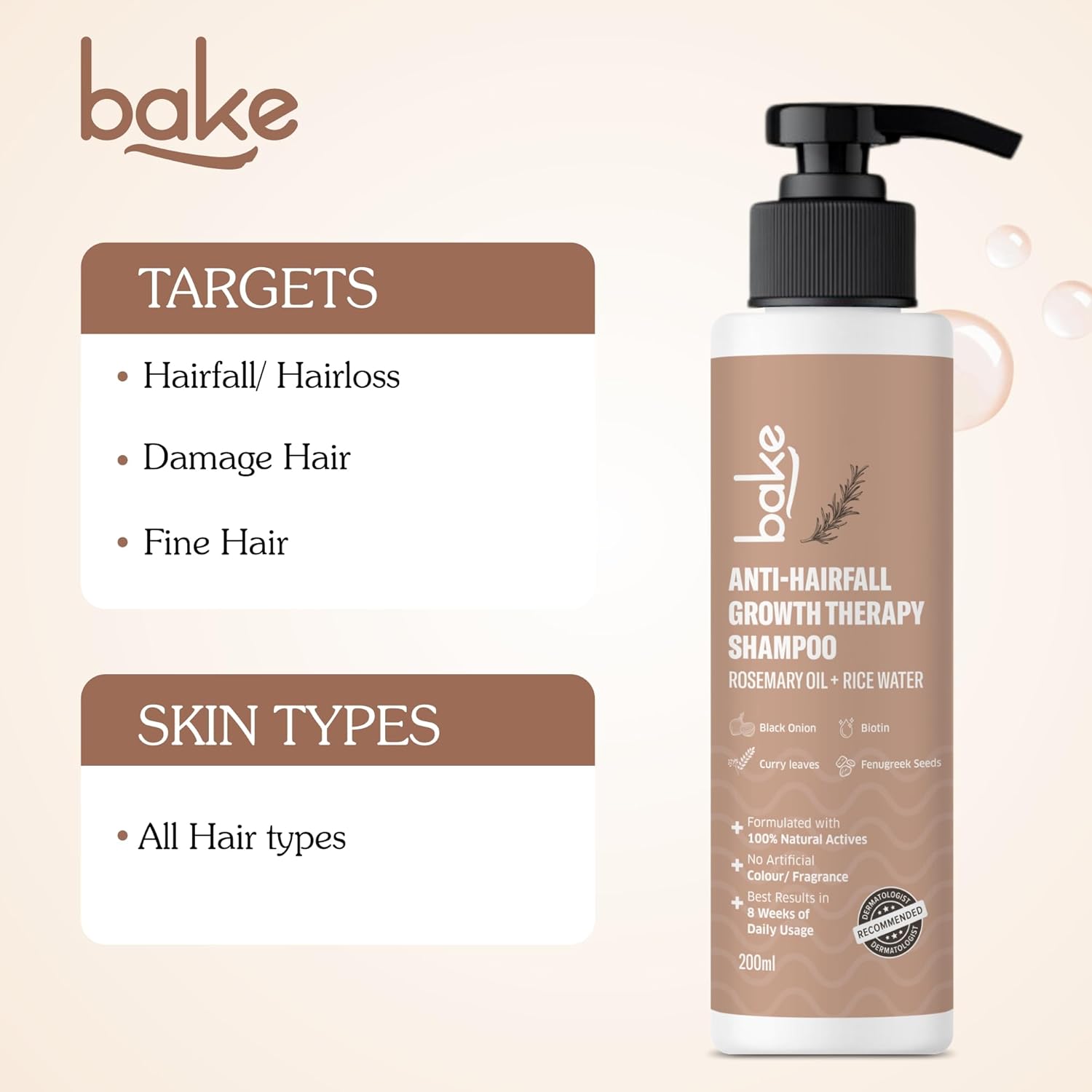 BAKE Rosemary Anti Hair Fall Shampoo for Hair Growth, Hair Fall & Dandruff Control with Black Onion & Methi Dana, Reduces Hair Loss & Prevents Hair Damage, For Men & Women - 200ml