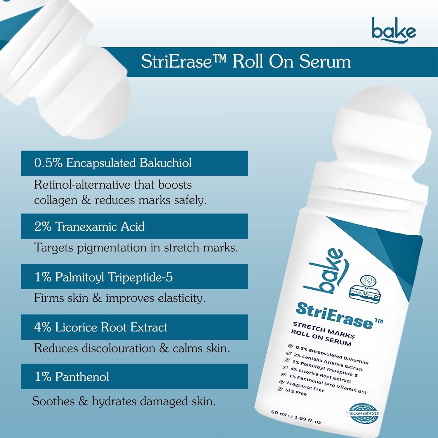 BAKE StriErase™ Stretch Marks Removal Roll On Serum | For Pregnancy Use | 0.5% Encapsulated Bakuchiol, 2% Centella Asiatica | Fades Stretch Marks & Scars, Firms Skin & Improves Uneven Skin | Fragrance Free, SLS Free – 50ml