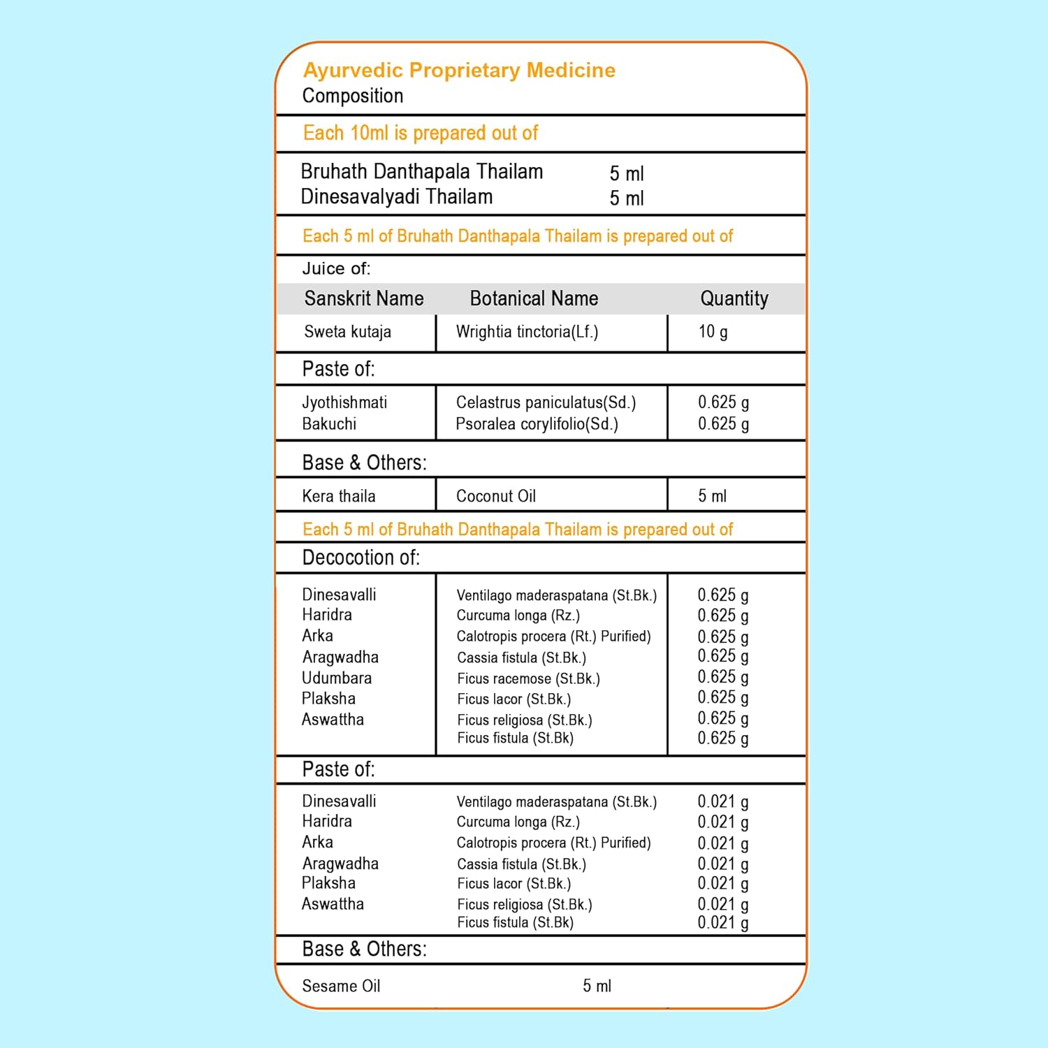 - ๐ฅ๐ฒ๐ฑ๐๐ฐ๐ฒ๐ ๐ฆ๐ฐ๐ฎ๐น๐ถ๐ป๐ด ๐ฎ๐ป๐ฑ ๐๐น๐ฎ๐ธ๐ถ๐ป๐ด : The powerful combination of Bruhath Danthapala and Dinesavalyadi thailams helps reduce the visible symptoms such as scaling and flaking of the skin, while also soothing itchiness and irritation