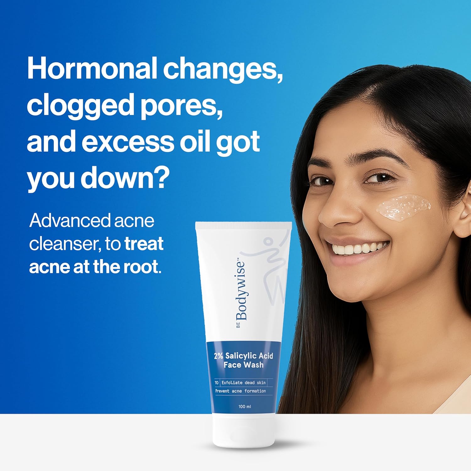 Be Bodywise 2% Salicylic Acid Face Wash for Acne Prone skin | For Oily & Sensitive skin | Deep Cleanses your Skin & Prevents Acne | Developed by Dermatologists | 100ml