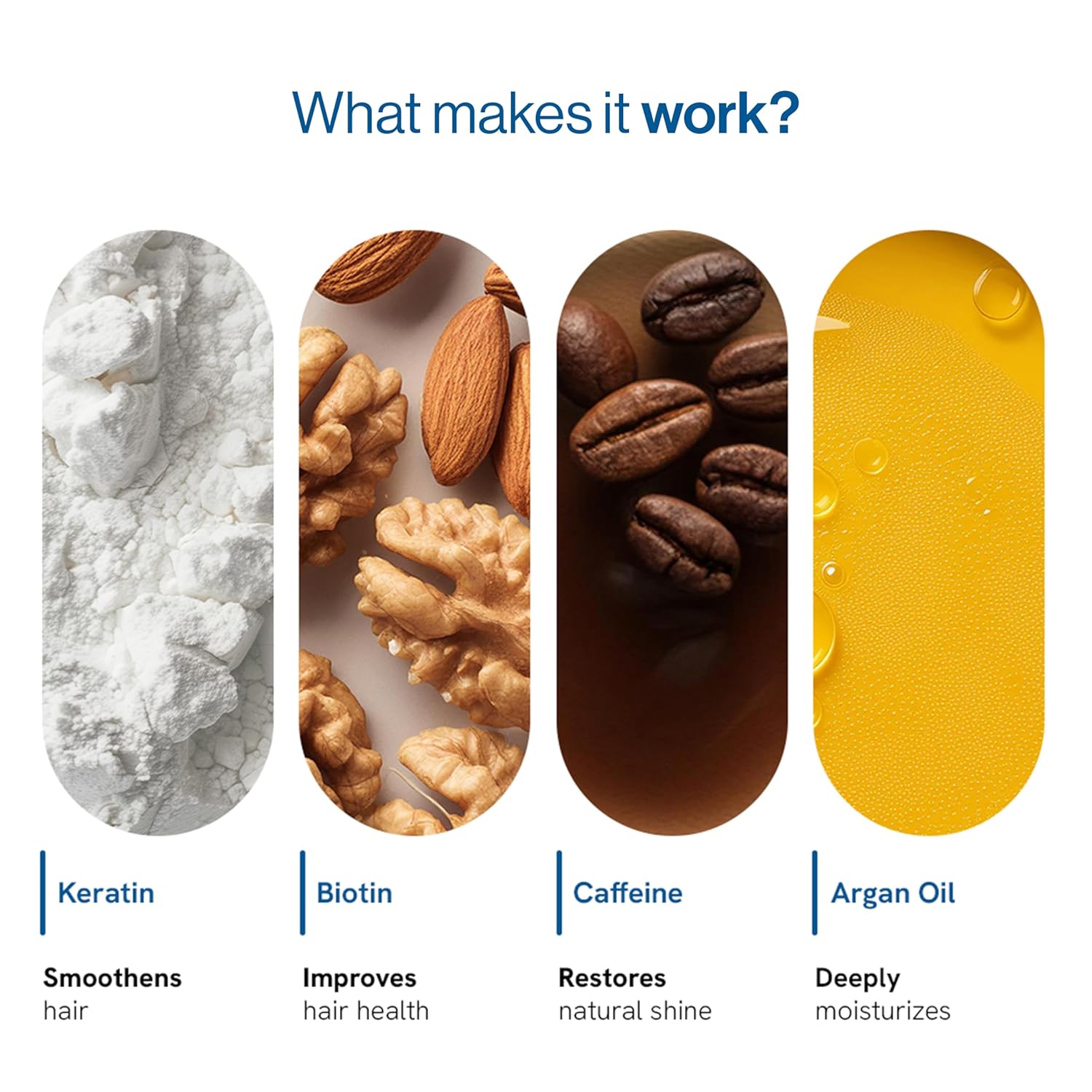 - 4 ESSENTIAL INGREDIENTS | Keratin (the building block of hair) repairs damaged strands & smoothens them, improving hair texture. Biotin prevents brittleness & breakage. Additionally, vitamins B3 and B5 help maintain hair & keep it in good condition.