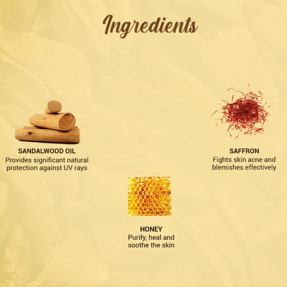 - Ingredients: Safed Chandan (Santalum Album),Ashwagandha (Withania Somnifera),Nag Kesar(Mesua Ferrea),Ankurit Gehun (Triticum Vulgare),Madhu (Honey),Arjun (Terminalia Arjuna),Rakt Chandan (Pterocarpus Santalinus),Lodhra (Symplocos Racemosa),Mom (Bees Wax) ,Sunfloweroil,Himalayan Water Q.S