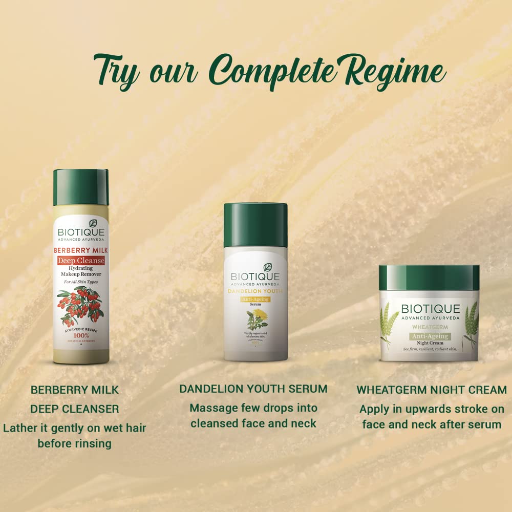 Biotique Wheat Germ Anti-Ageing Night Cream is a luxurious anti ageing cream for women with nourishing botanical extracts, wheat germ, sunflower & almond oils, vitamins A, B, C, D, E, and carrot extracts. It moisturizes, strengthens, and promotes younger-looking skin.