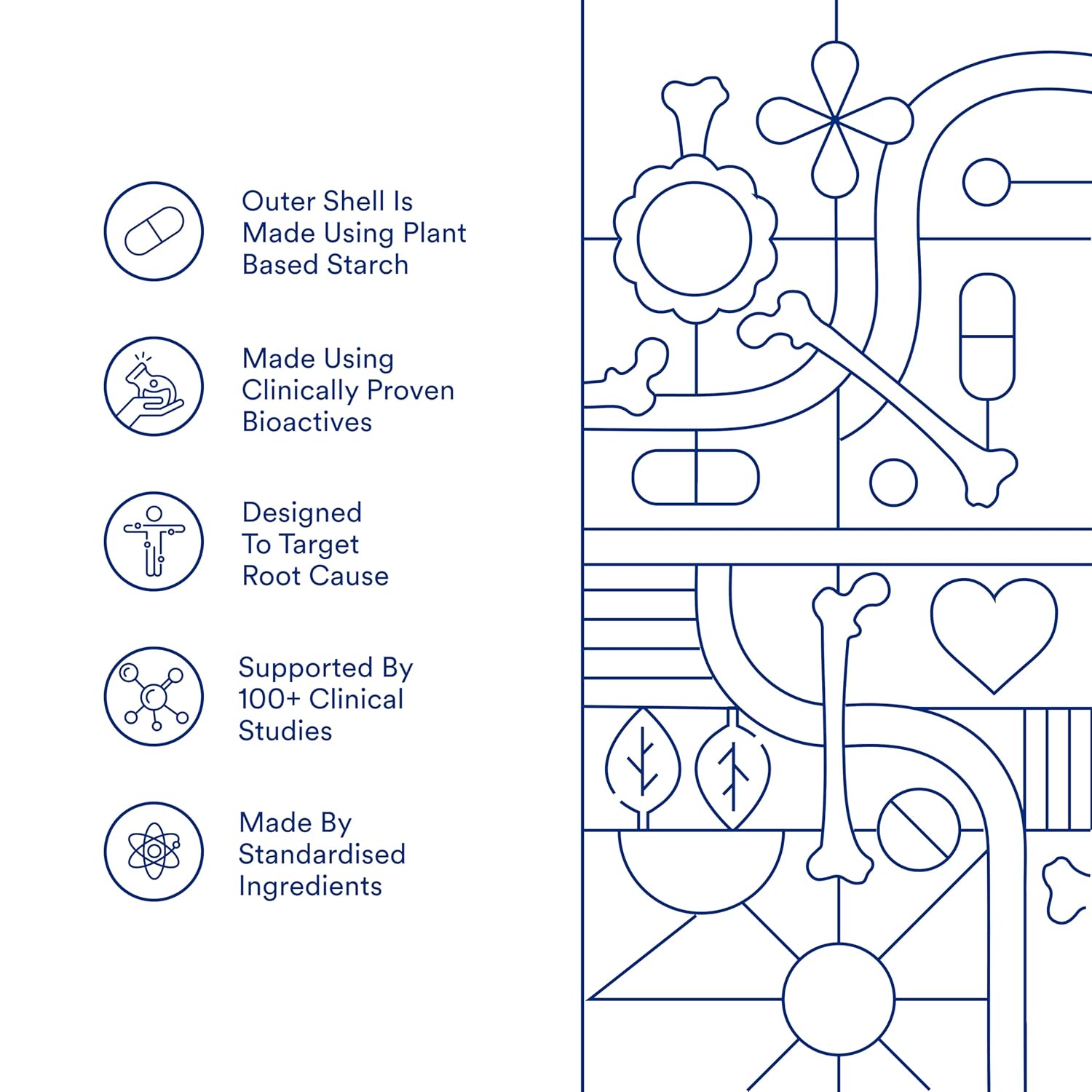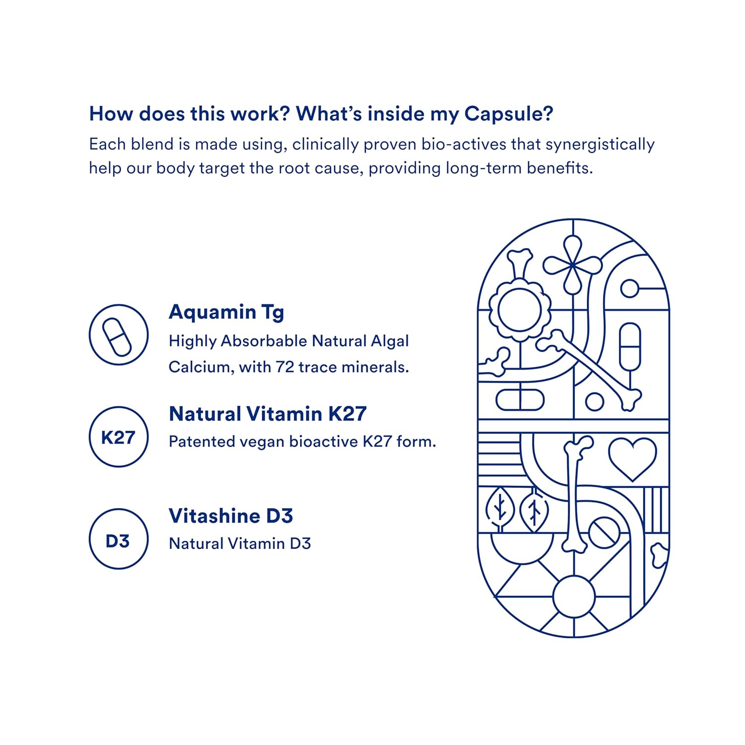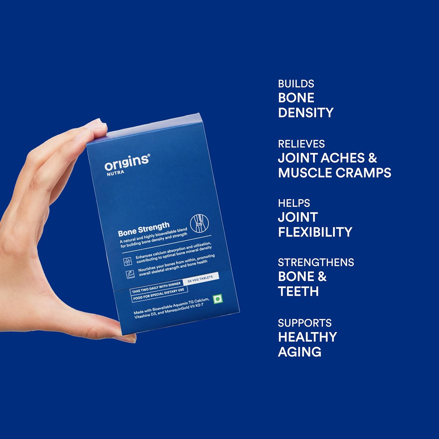 Imagine your bones as a majestic castle. Origins Nutra Bone Strength is the master mason, providing potent building blocks and skilled artisans (nutrients) to fortify your internal fortress. Highly Absorbable algal calcium i.e AQUAMIN TG lays the foundation, Vitashine Vitamin D3 and Bioactive K2-7 act as architects and planners, and add strength and elasticity to the bones.