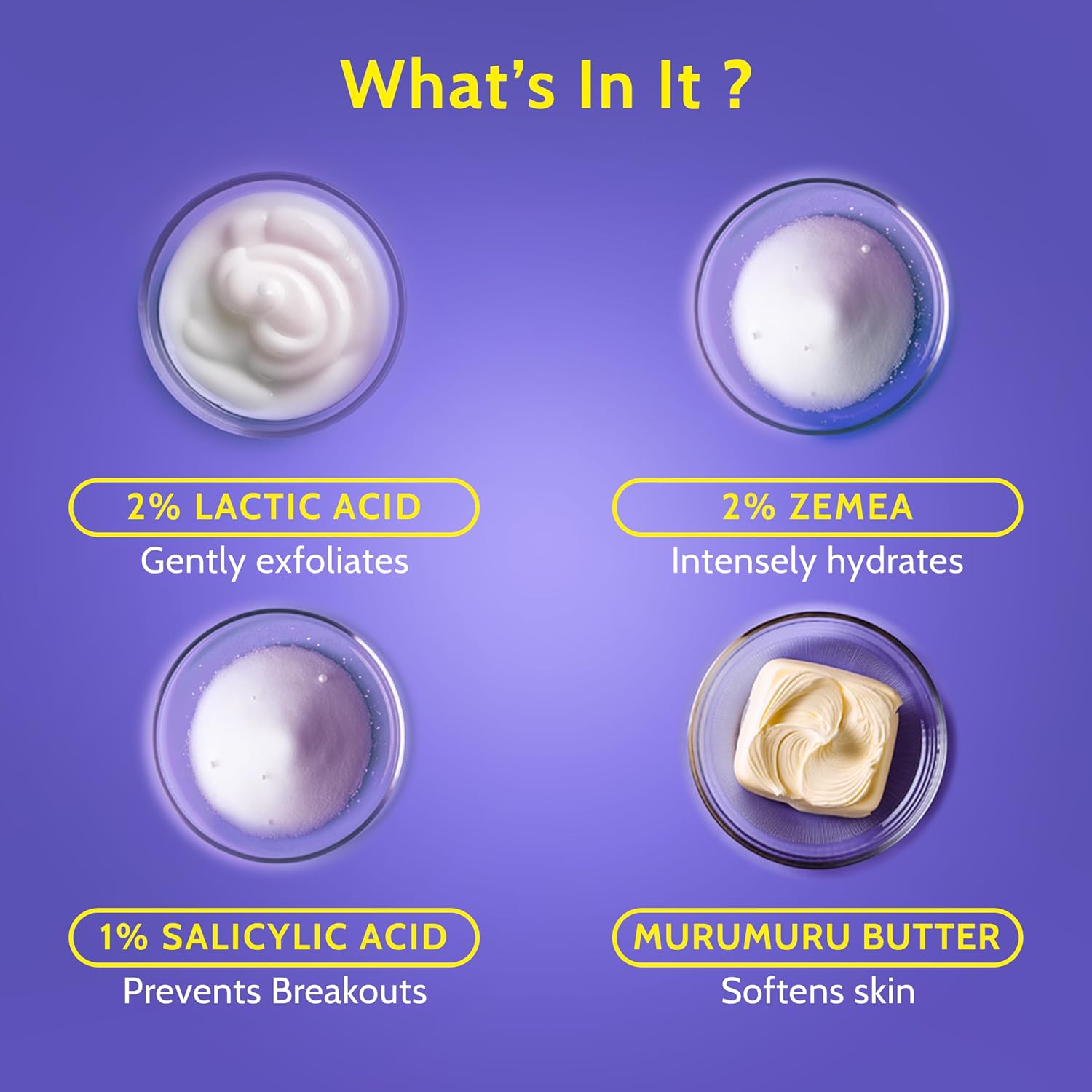 - IMPROVES THE SKIN'S TEXTURE: Our body wash is enriched with Lactic Acid which gently exfoliates the dead skin cells, improving the overall appearance of the skin. It also evens out the skin tone and also helps fade age spots.