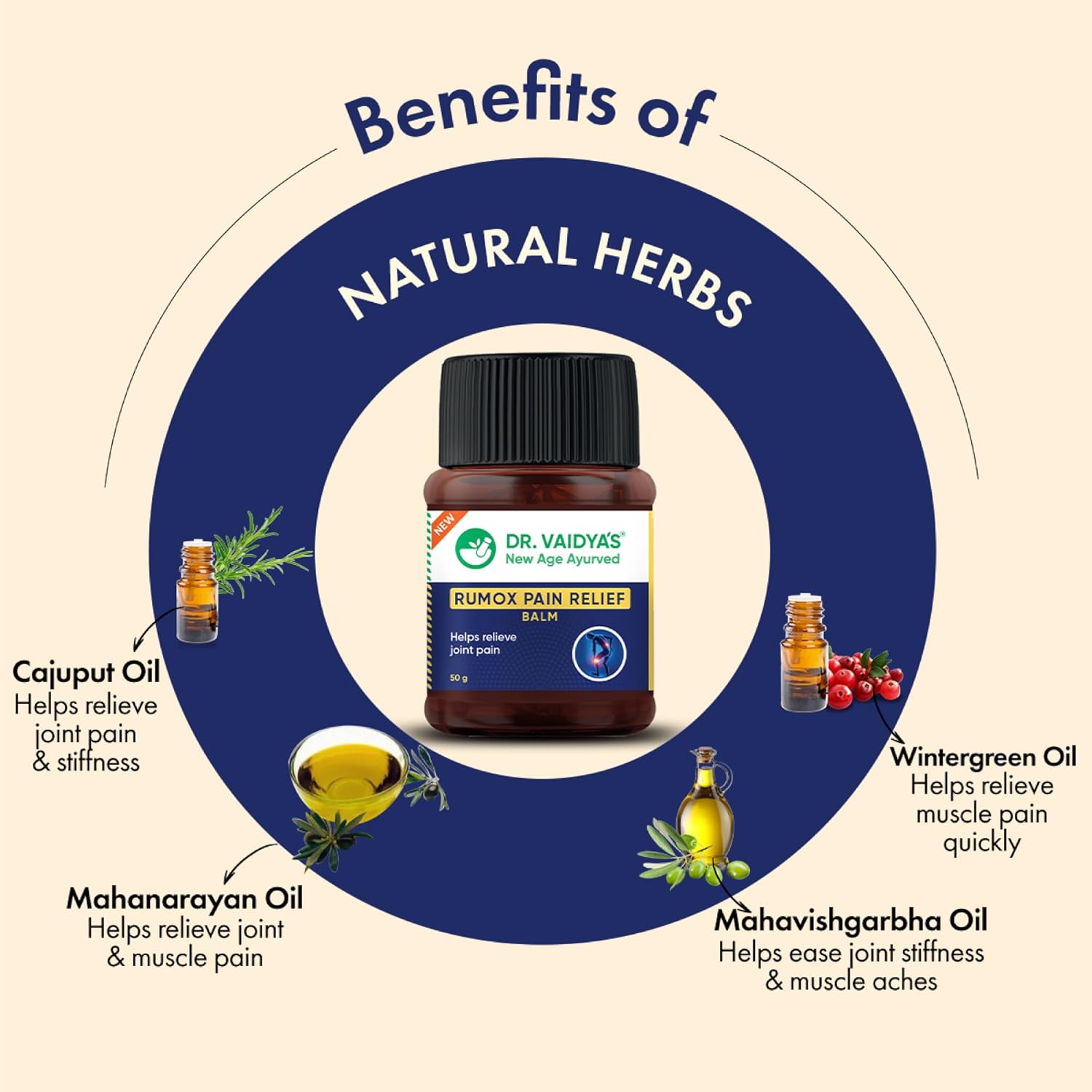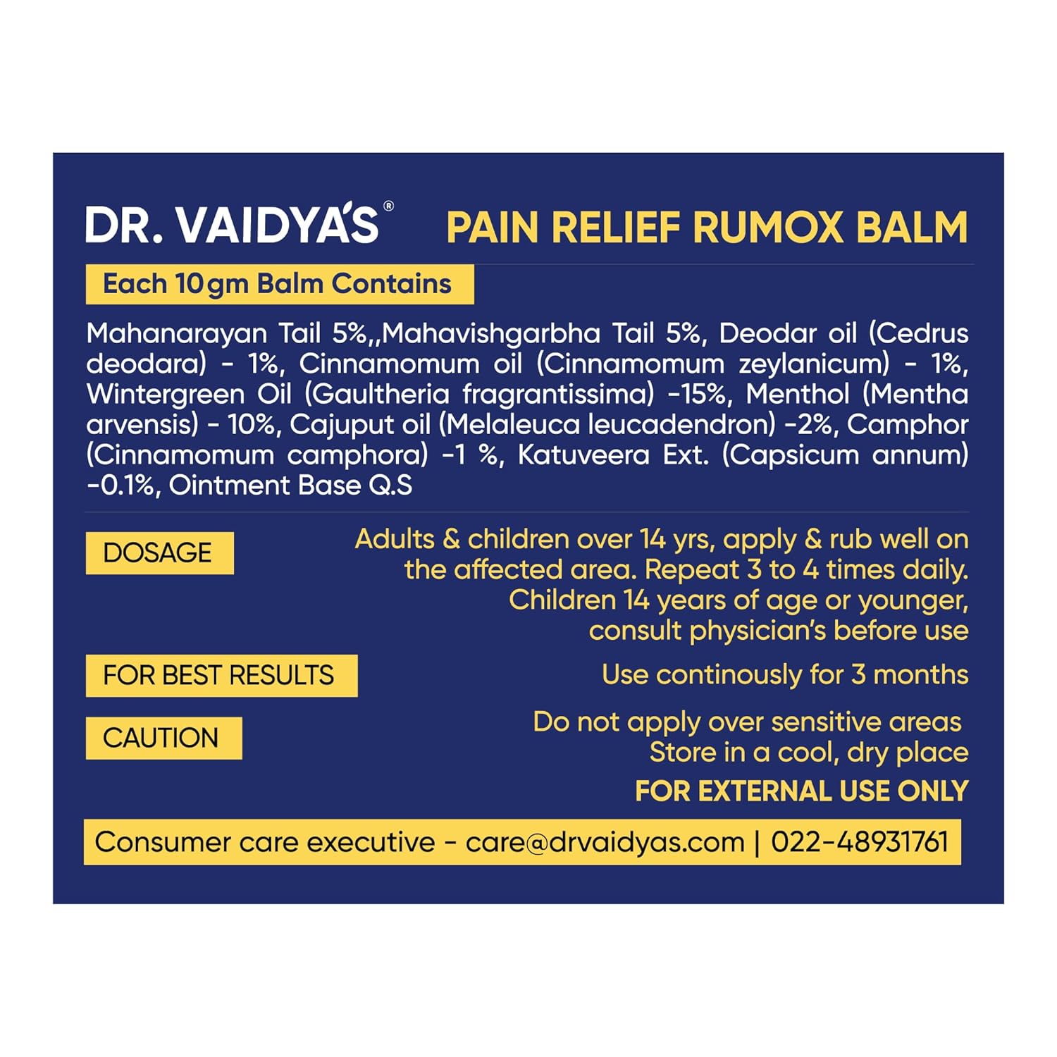 Dr. Vaidya's Rumox Pain Relief Balm | For Head Ache, Body Pain, Joint & Muscle Pain | Mix Of Oils - Mahanarayan, Cajuput, Wintergreen | (50g Each)