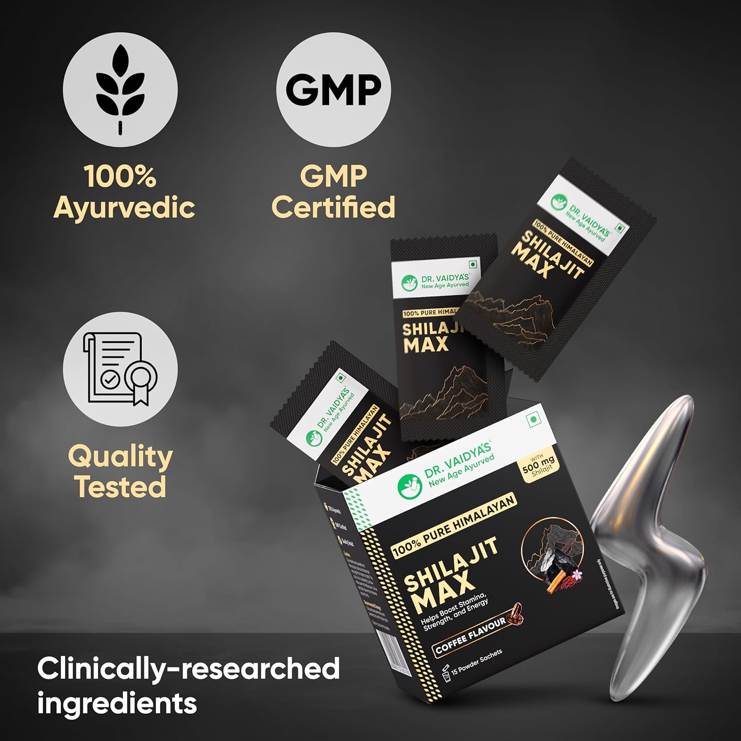 Dr. Vaidya's Shilajit Max|For Stamina On the Go|Boosts Strength & Energy levels|500 mg of 100% Pure Himalayan Shilajit In Coffee Flavour,Pippali,Dalchini,Ela & Saffron |15 Powder Sachets (Pack 1)