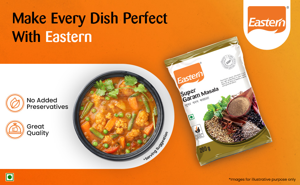 "Looking for your perfect taste partner for curries, biryanis, veggies and fries? Look no further than Eastern Super Garam Masala Powder! A blend of 14 aromatic ingredients perfectly enhances the flavour of any Indian cuisine. Crafted to perfection by Eastern Condiments, this masala powder is ground to perfection, ensuring every dish you make bursts with flavour. And with no added colour, or preservatives, eat without worrying! Eastern Super Garam Masala Powder is just one of many delectable masalas offered by Eastern like Eastern Sambhar Powder, Eastern Kashmiri Chilli Powder, and Eastern Garam Masala. Eastern has everything you need. So why wait? Join us in our mission to make delicious and flavoursome fish fry with ease at home. Available in a convenient 200g pack, this masala powder is perfect for home cooks and professional chefs alike. Add a dash of Eastern's Super Garam Masala Powder to elevate your cooking!"