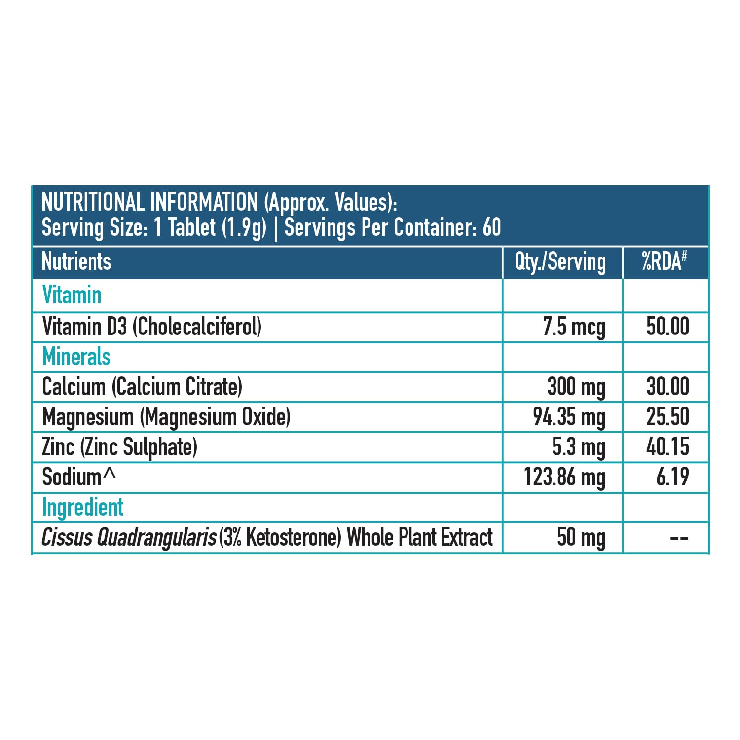 Calcium Citrate, Magnesium oxide, Cissus quadrangularis, Zinc sulphate, Vitamin D3. ADDITIVES: Disintegrant [INS 466). Diluent [INS 460 (01). Binding agent [Maize Starch). Stabilizer [INS 1202), Coating, agent [INS 464]. Anti-caking agent [INS 551. INS 470 (1). CONTAINS PERMITTED NATURAL FOOD COLOUR [INS 171]