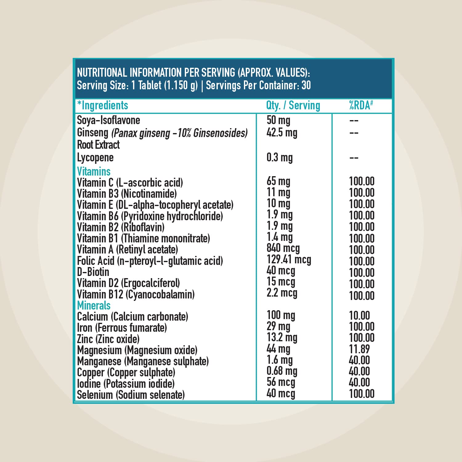 Calcium Carbonate, Bulking Agent[INS 460(i)], Ferrous Fumarate, L-ascorbic Acid, Magnesium oxide, Soya-Isoflavone, Ginseng root extract, Disintegrants (INS 468, INS 1202 & Sodium starch glycolate), Binding Agent, (INS 1201), DL-alpha-tocopheryl acetate, Bulking agent(INS 421), Zinc oxide, Nicotinamide, Anti-sticking agent[INS 470(iii)], Anti-caking Agent(INS 551), Glazing Agent(INS 553(iii)), Ergocalciferol, Retinyl acetate, Manganese sulphate, D-Biotin, Pyridoxine hydrochloride, Copper Sulphate, Riboflavin, Thiamine mononitrate, Lycopene, Cyanocobalamin, n-pteroyl-l-glutamic acid, Sodium selenate, Potassium iodide & Thickeners[ INS 462, INS 464]