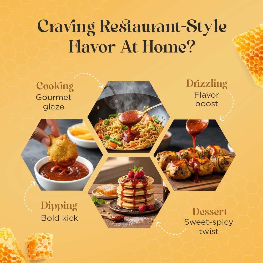 - Real Honey for Sweet-Spicy Goodness: Hexhive Honey Chilli Sauce is a delicious blend of natural honey, tomato and chilli flakes for the perfect balance of sweet heat. Adds a rich, glossy and bold taste to snacks.