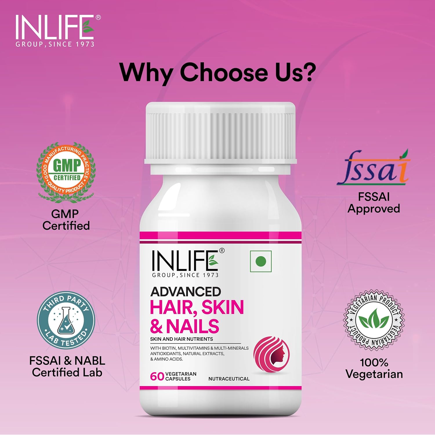 INLIFE Advanced Hair Skin & Nails Supplement with Biotin, Multivitamin Minerals, Amino Acids for Hair Care - 60 Vegetarian Capsules