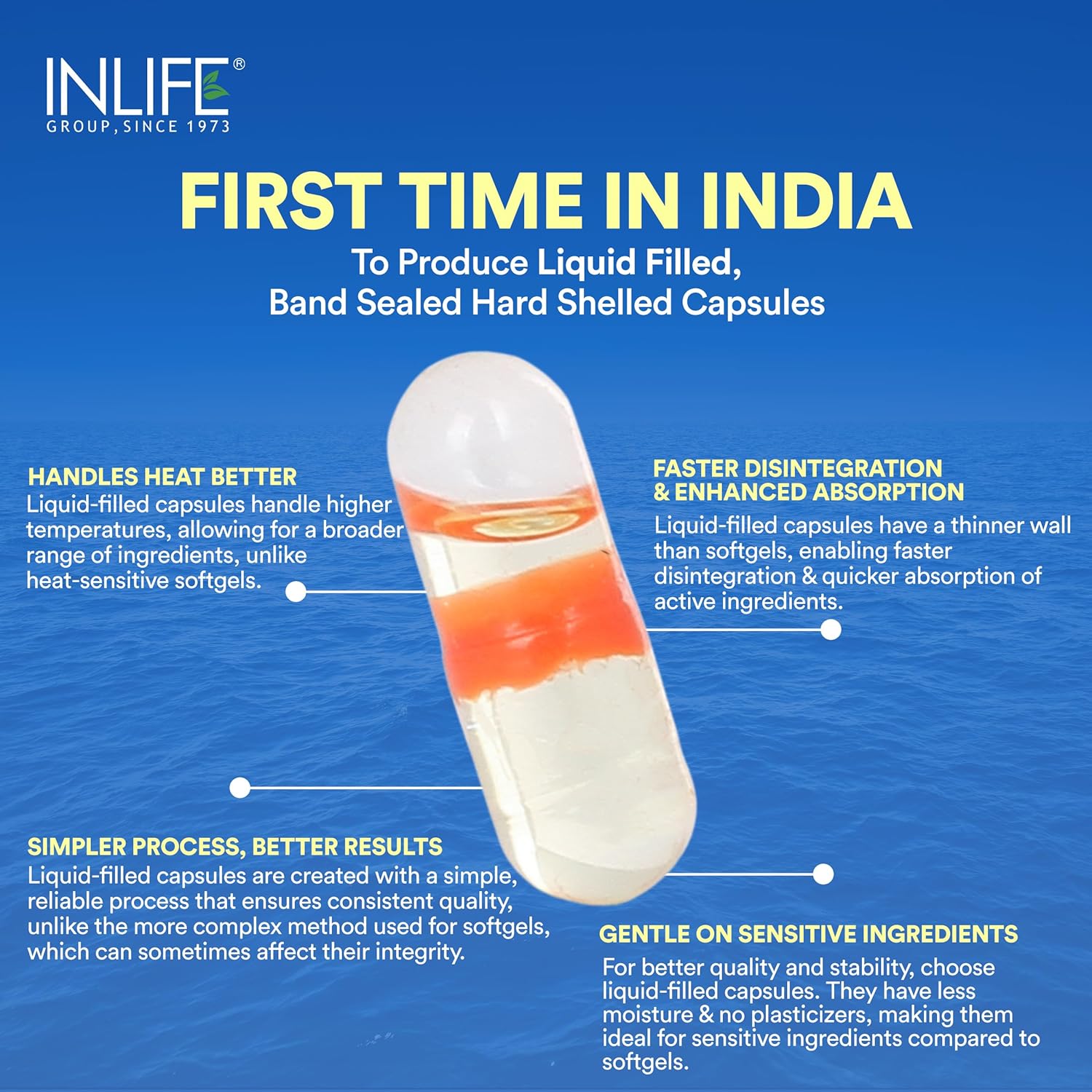 - Double Strength Omega-3 Fish Oil Capsules – INLIFE Omega 3 fish oil 1000mg per serving delivers a potent 36:24 ration of EPA & DHA in Advanced India’s first-ever band-sealed, hard-shelled capsules.