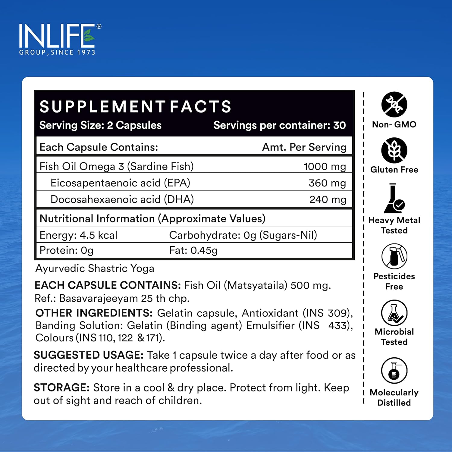 - No Fishy After Taste- INLIFE Omega 3 Fish Oil Capsules 1000mg are enriched with top-grade Omega 3 that leaves no unpleasant fishy aftertaste/burps.