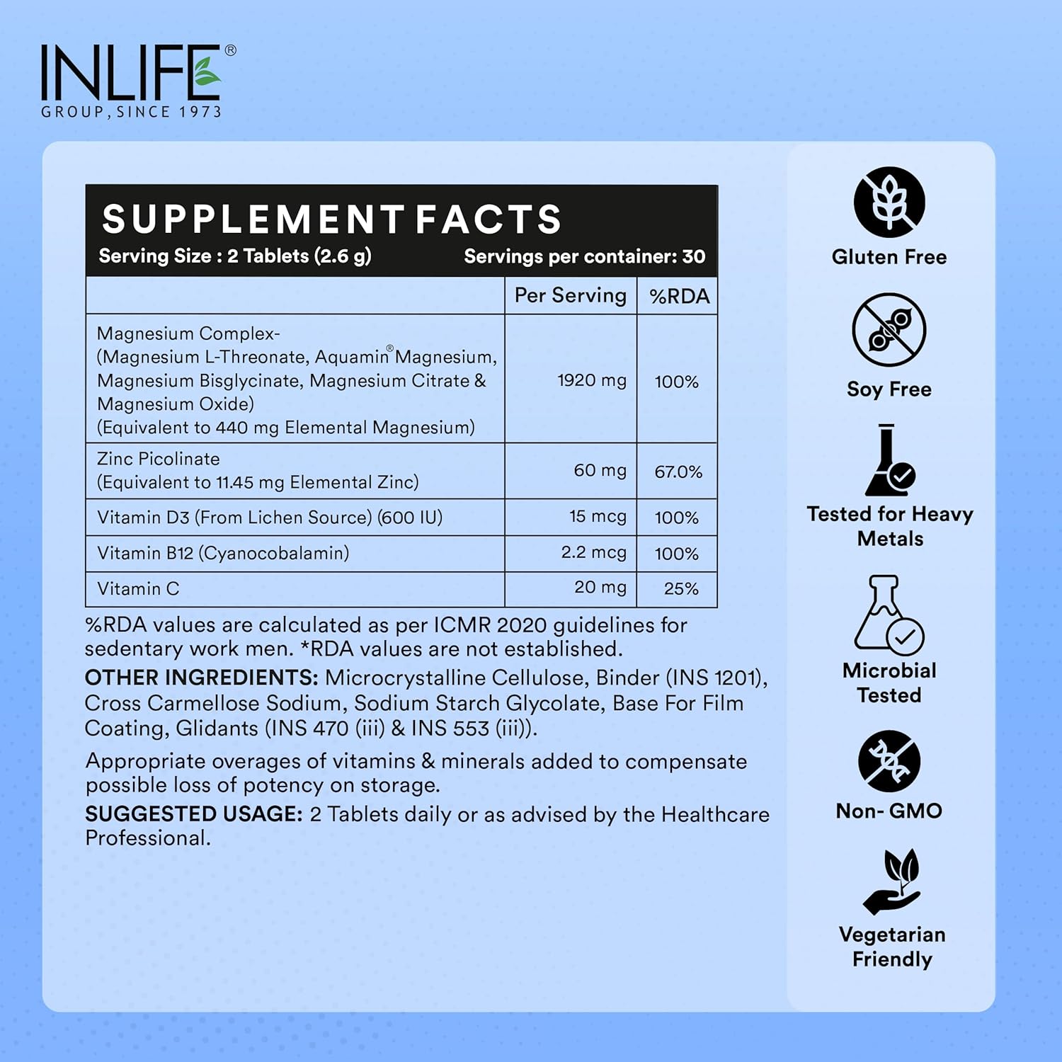 INLIFE Magnesium Supplement 2000mg | 5x Chelated Magnesium Complex Glycinate, L Threonate, Citrate, Oxide with Aquamin, Zinc, Vitamin C, D3 & B12 | For Sleep, Focus, Muscles, Immunity - 60 Tablets