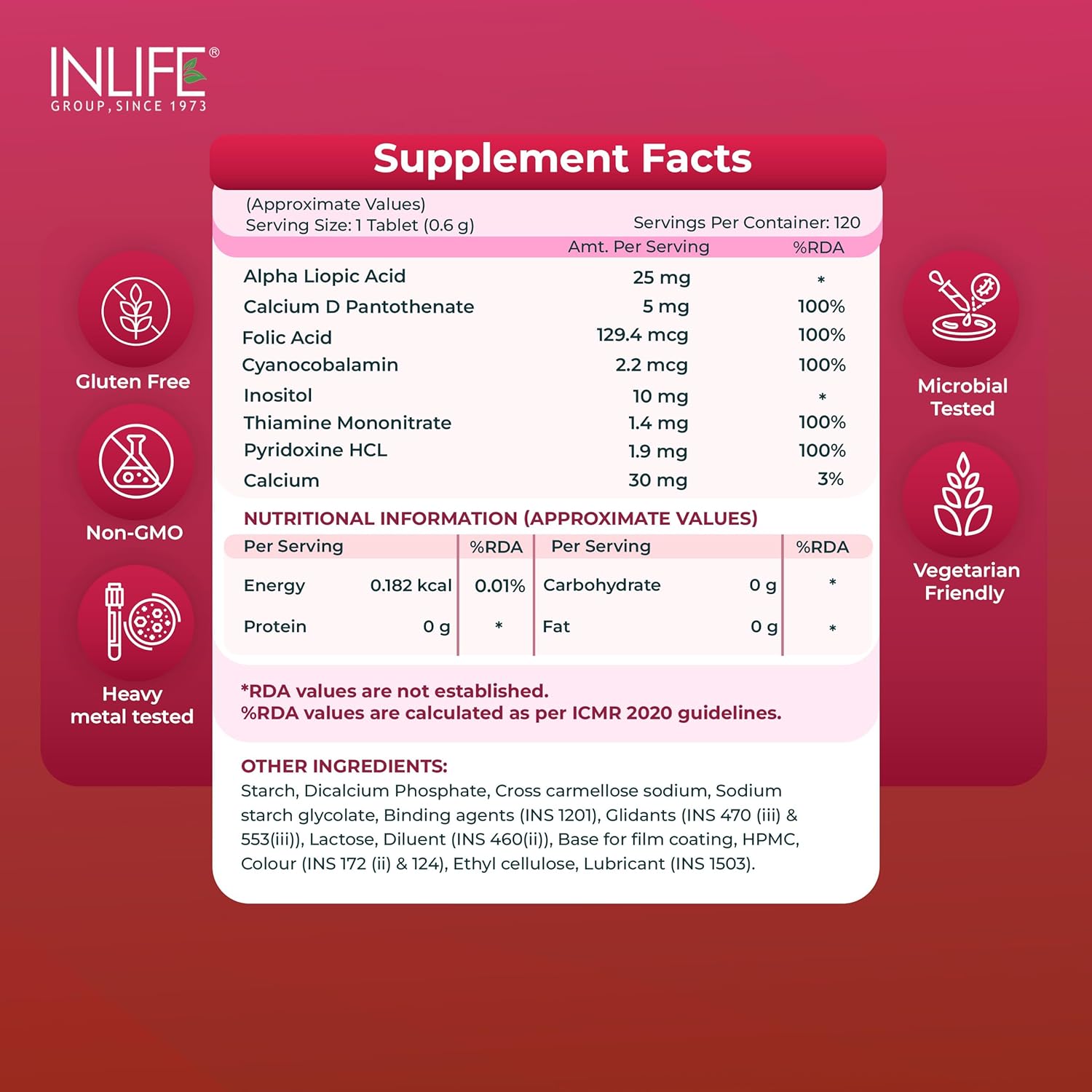 INLIFE Vitamin B12 With Alpha Lipoic Acid, Folic Acid, Inositol, B1, B5 & B6 Supplements Tablet, Supports Nerve Health, Immunity for Men & Women - 120 Tablets (Vit B12, Pack of 1)