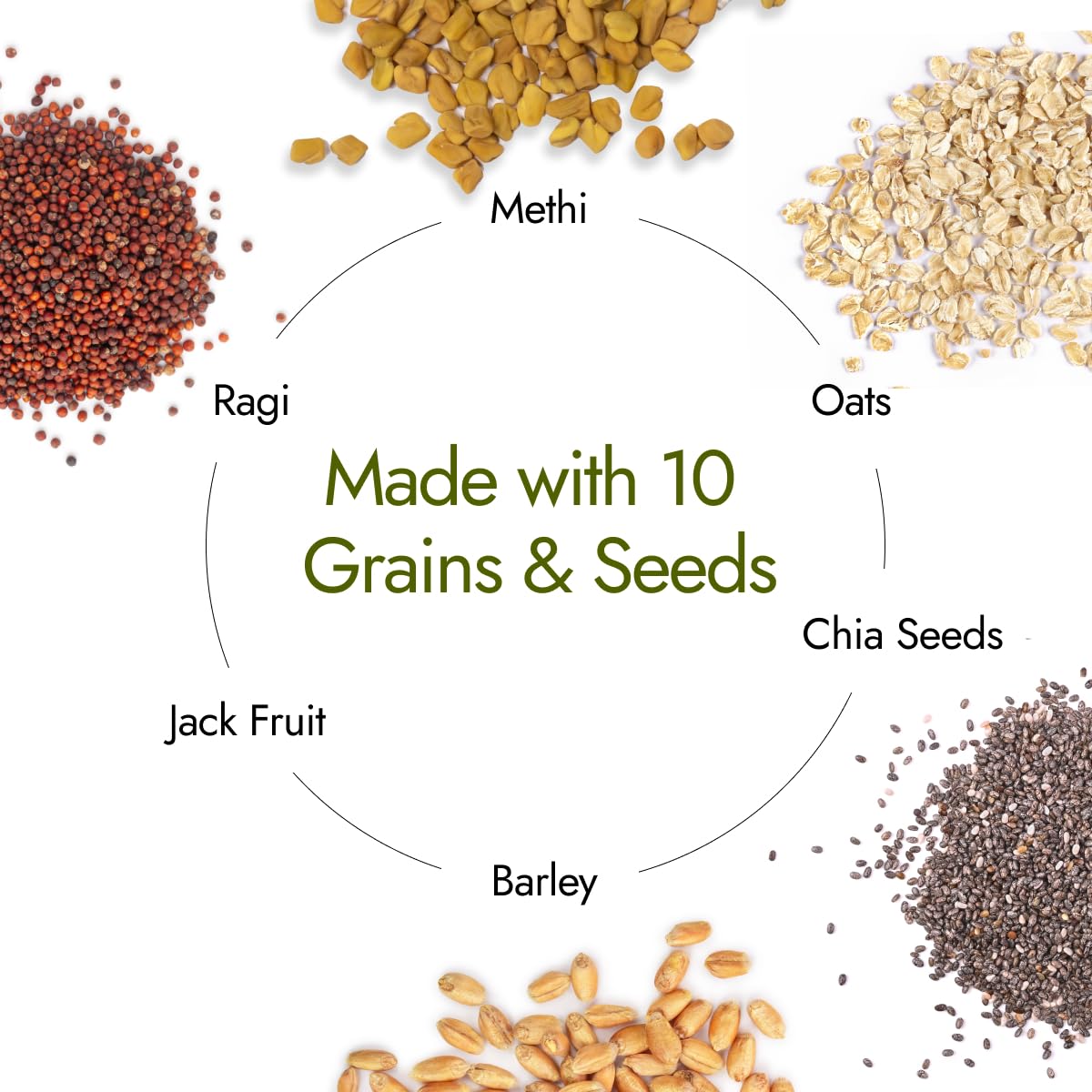 Each 100g contains: Fenugreek (Trigonella foenum-graecum) Sd pwd: 45g, Barley (Hordeum vulgare) Sd. Pwd 11.15g, Jack fruit (Artocarpus heterophyllus) Fr. Pwd 20g, Buckwheat (Fagopyrum esculentum) Sd. pwd 7.5g, Oats (Avena sativa) Sd. pwd 5g, Ragi (Eleusine coracana) Sd. pwd 5g, Rajgeera (Amaranthus tricolor) Sd. pwd 4g, Flaxseed (Linum usitatissimum) Sd. pwd 2g, Chia (Salvia hispanica) Sd. pwd 0.25g, Pumpkin (Cucurbita pepo) Sd. pwd 0.1g