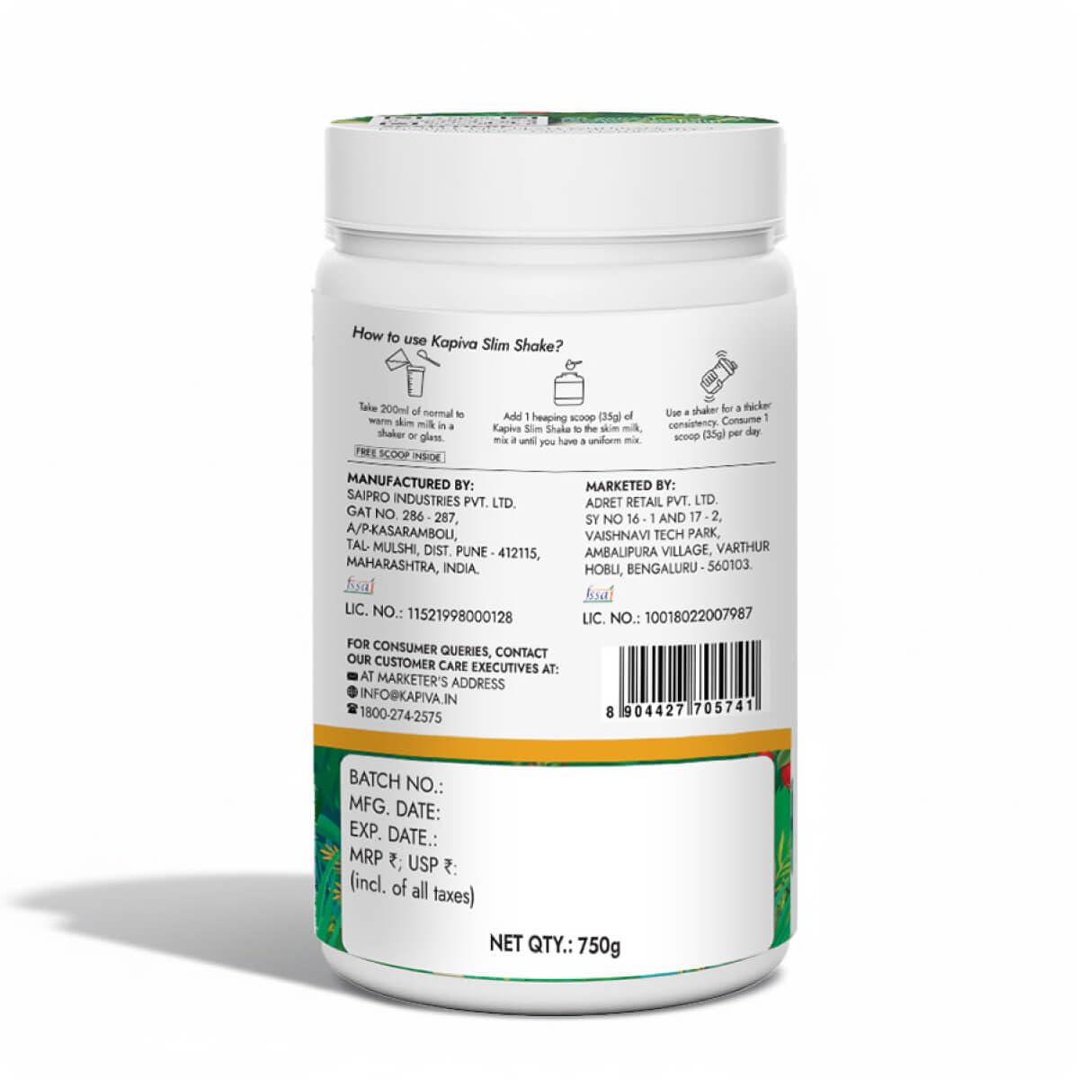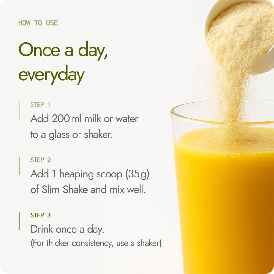 Take 200 ml of normal or warm skim milk or water in a shaker or glass. Add 1 heaping scoop (35 g) of Kapiva Slim Shake to the milk and mix until smooth. For a thicker consistency, use a shaker. Consume 1 scoop (35 g) per day.