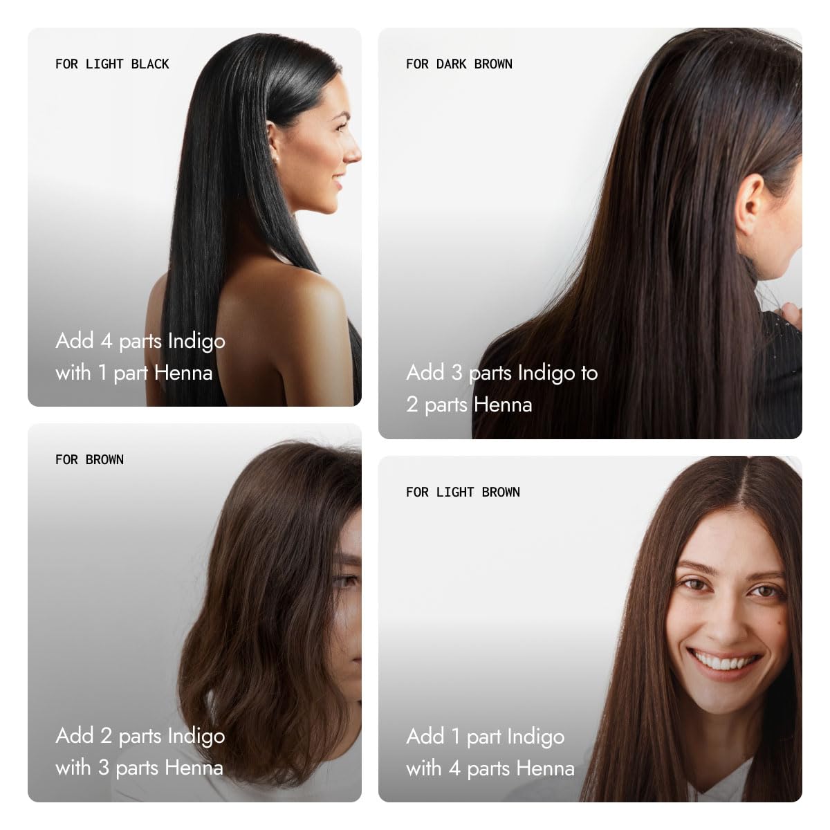 - ANY SHADE YOU WANT - A variety of shades is possible with the Hair Colour Rituals Combo. For light black, you would need 4 parts of Indigo Powder with 1 part of Henna Powder. For dark brown, mix 3 parts of Indigo Powder with 2 parts of Henna Powder. For brown, mix 2 parts of Indigo Powder with 3 parts of Henna Powder. For light brown, mix 1 part of Indigo Powder with 4 parts of Henna Powder.