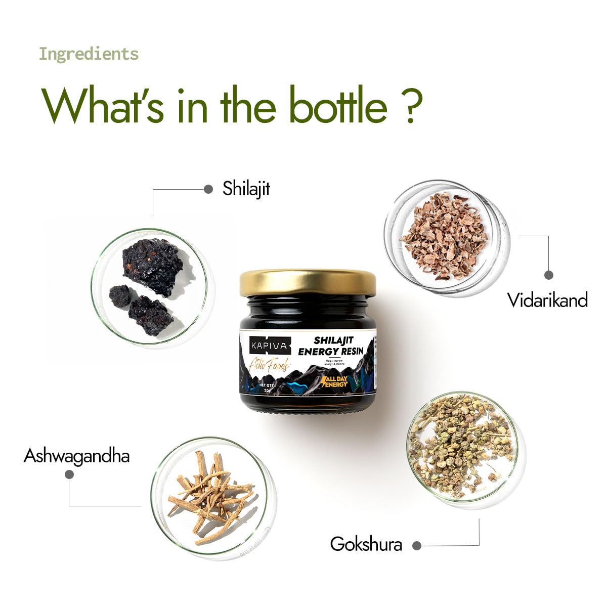- This energy resin combines four potent herbs like Shilajit, Ashwagandha, Vidarikand, and Gokshura—that work together to boost cellular energy, reduce stress, improve circulation, and help sustain all day energy.