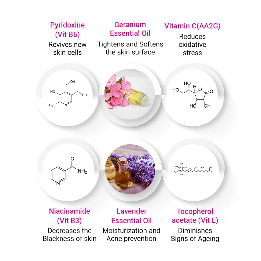 | Special Ingredients | Geranium Oil, Lavender Oil, Niacinamide, Vitamin C & E |