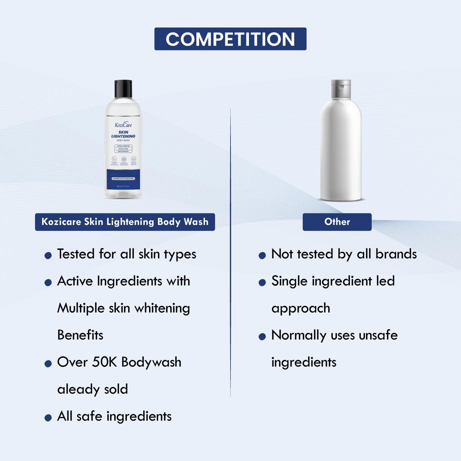 - ✅ Smoothens Rough And Bumpy Skin Texture: Transform rough and bumpy skin texture into silky-smooth perfection with our Kozicare Skin Lightening Soap Body Wash. Specially formulated to gently exfoliate and refine the skin's surface, it leaves your skin feeling irresistibly soft, smooth, and supple after each use.