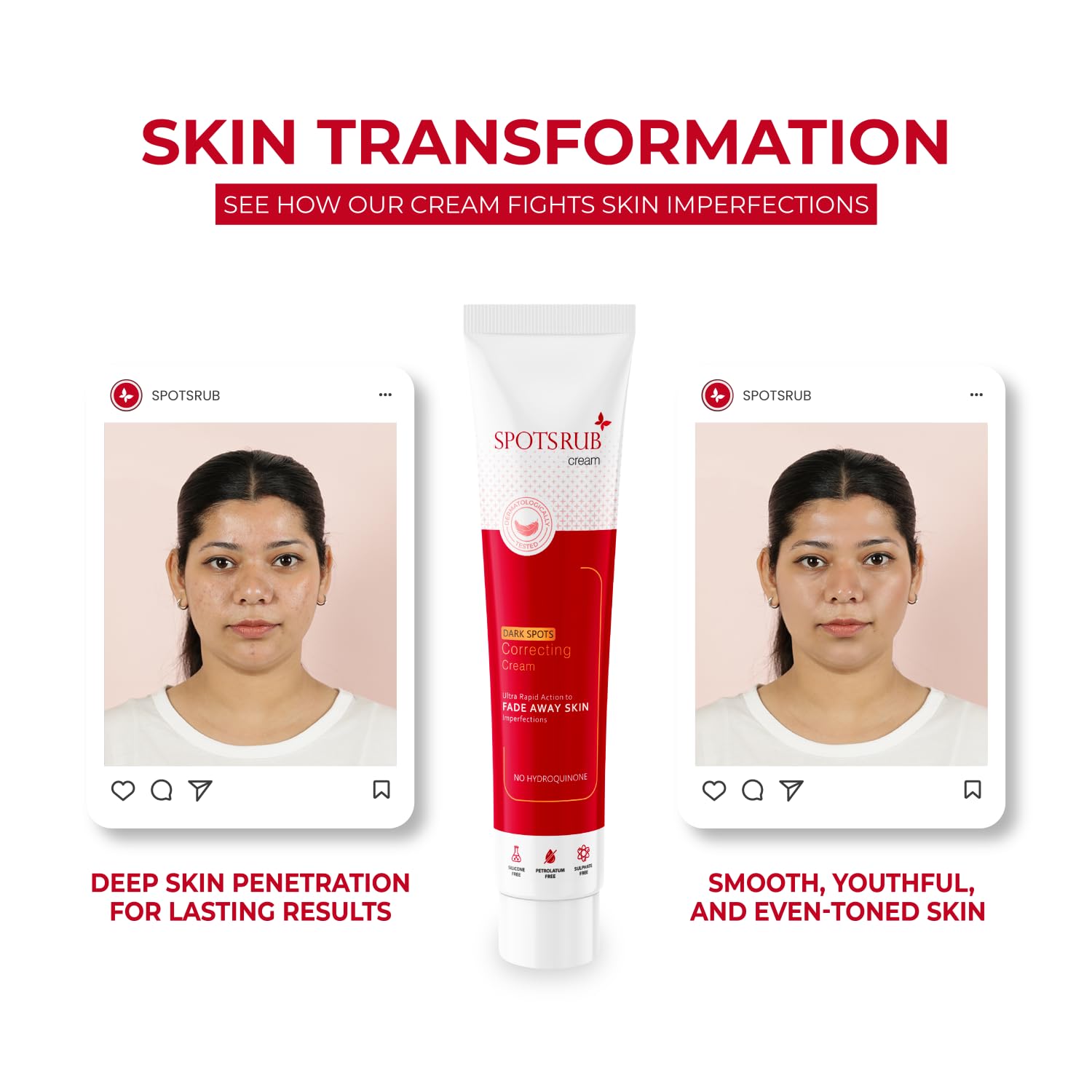 - Mild and Safe for All Skin Types: Spotsrub Cream is formulated with safe, dermatologically tested ingredients, free from hydroquinone, parabens, and sulfates. Its gentle yet effective formula for daily use on all skin types, including oily skin, making it suitable for both men and women.