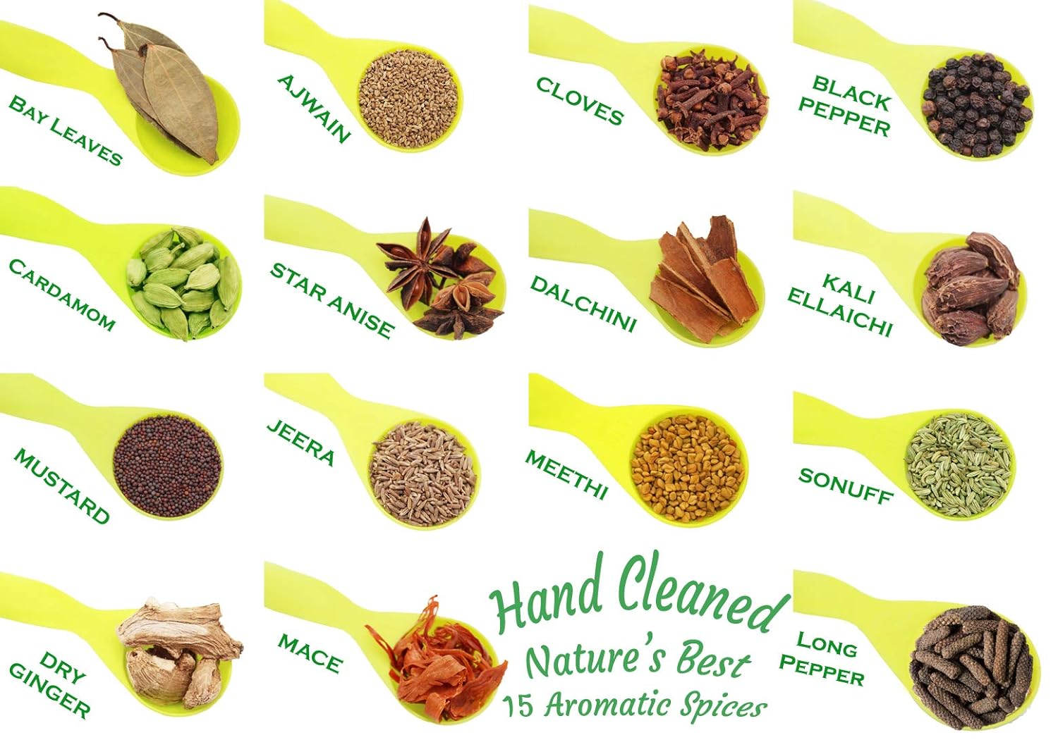 - NET CONTENTS : Bay Leaves, Ajwain, Kali Elaichi, Black Pepper, Green Cardamom, Cinnamon, Cloves, Jeera, Long Pepper (Pippali), Dry Ginger, Saunf, Meethi, Javintri, Mustard & Star Aniseed. Power of 15 Whole Raw Spices in One Buy. Escape from buying each one of them separately