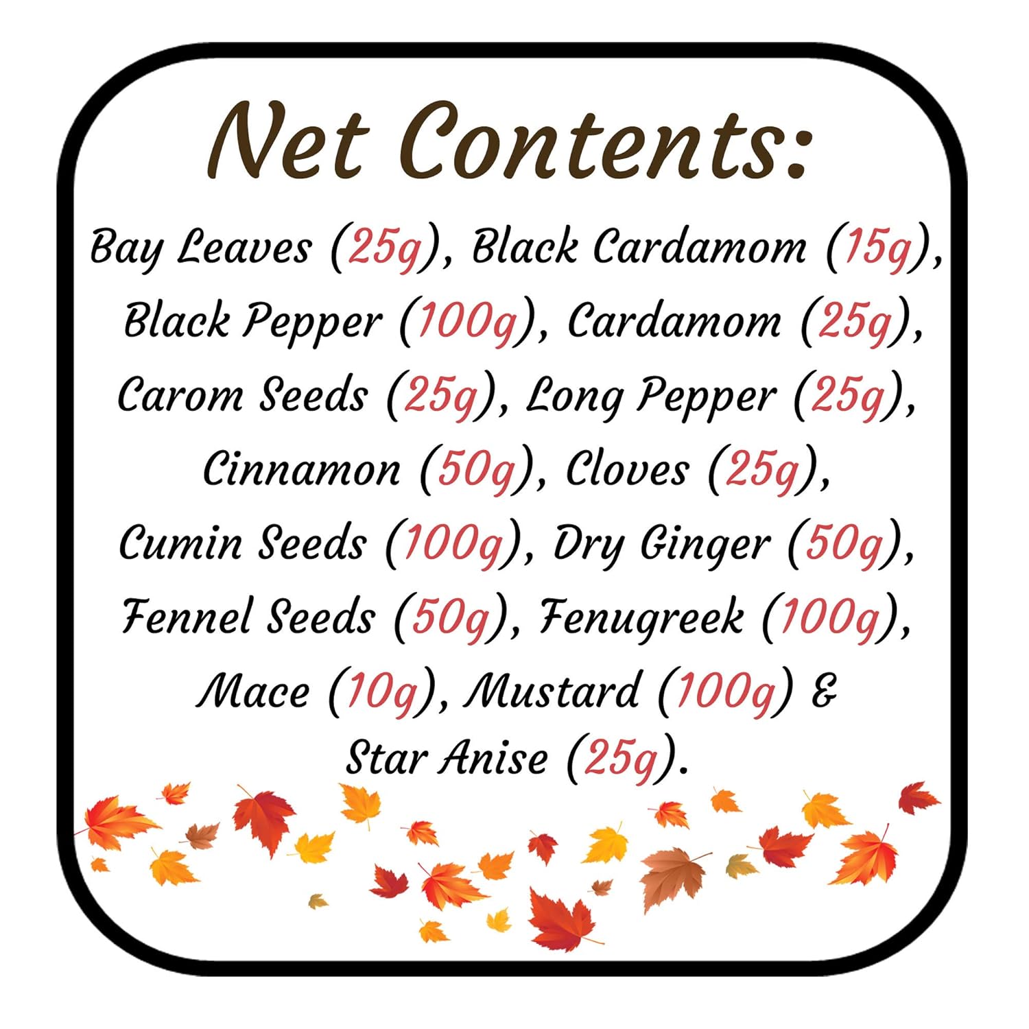 Bay Leaves 25g, Ajwain 25g, Kali Ellaichi 15g, Black Pepper 100g, Green Cardamom 25g, Long Pepper (Pipali) 25g, Cinnamon 50g, Cloves 25g, Jeera 100g, Dry Ginger 50g, Saunf 50g, Meethi 100g, Javintri 10g, Mustard 100g & Star Aniseeds 25g