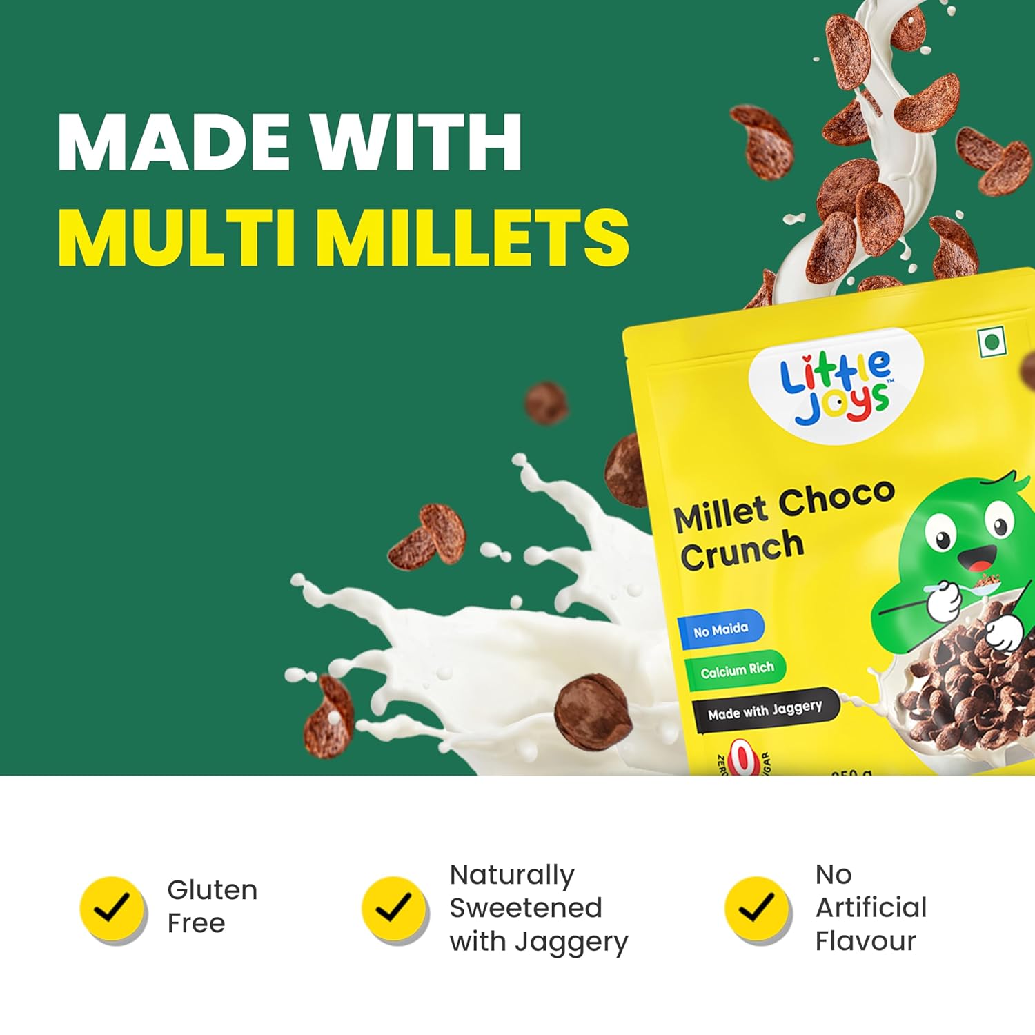 - Wholesome Breakfast for Kids – Little Joys Millet Choco Crunch is a tasty and healthy breakfast option made with a blend of ragi, jowar, red rice, and foxtail millet.