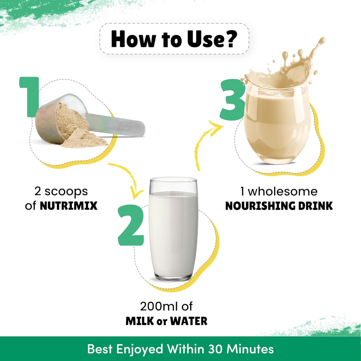 - EASY TO MIX: Just mix 2 scoops of Vanilla Nutrimix with 200 ml of water or milk and drink within 30 minutes