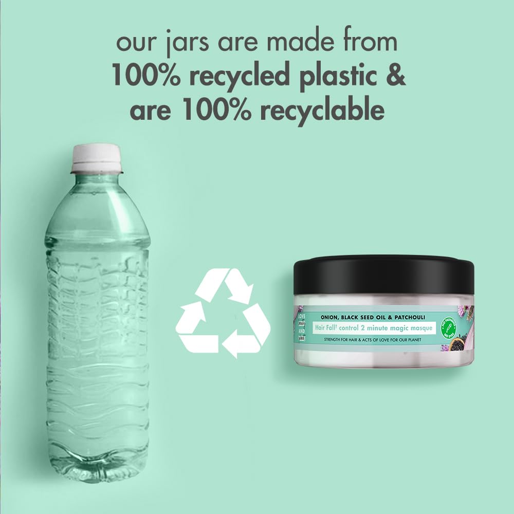 Say goodbye to hair fall worries and hello to beautiful, strong strands with our Hair Fall Control* Hair Mask. This plant-based conditioning mask is made with plant-based detanglers and 100% organic coconut oil. It has the goodness of natural Onion and Blackseed oil to help strengthen hair and nourish scalp. The ethically sourced Indonesian Patchouli leaves behind a strong, addictive fragrance. How to use? You know it – Take a generous amount of mask and apply from mid-length to the tips, keep for 2 minutes and then rinse. Go easy on the tap! Our goal is a carbon footprint so small, it's like we weren't even here. We, at Love Beauty & Planet have started our journey by loading our products with natural goodness and packing it in bottles made from 100% recycled plastic. Our delicate scents are infused with natural and ethically sourced oils and extracts. All our jars and bottles are made up of 100% recycled plastic waste and are completely recyclable. Our caps and pumps aren’t made from recycled plastics yet, but we’re working on it. Our products are free from added harsh chemicals like added phthalates, added parabens and dyes. Love Beauty & Planet is PETA Certified cruelty-free and vegan. Globally, Love Beauty & Planet does not test on animals. We are committed to acts of love that make our planet cleaner, greener and more beautiful.