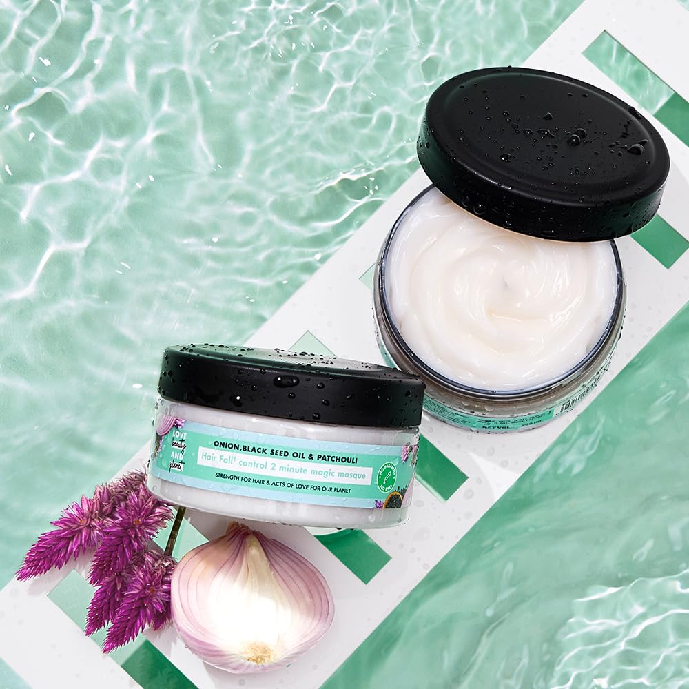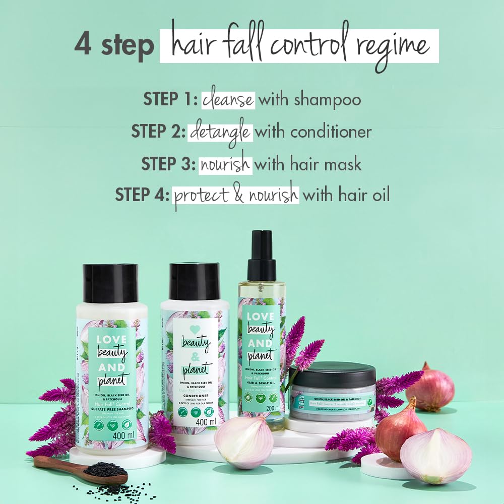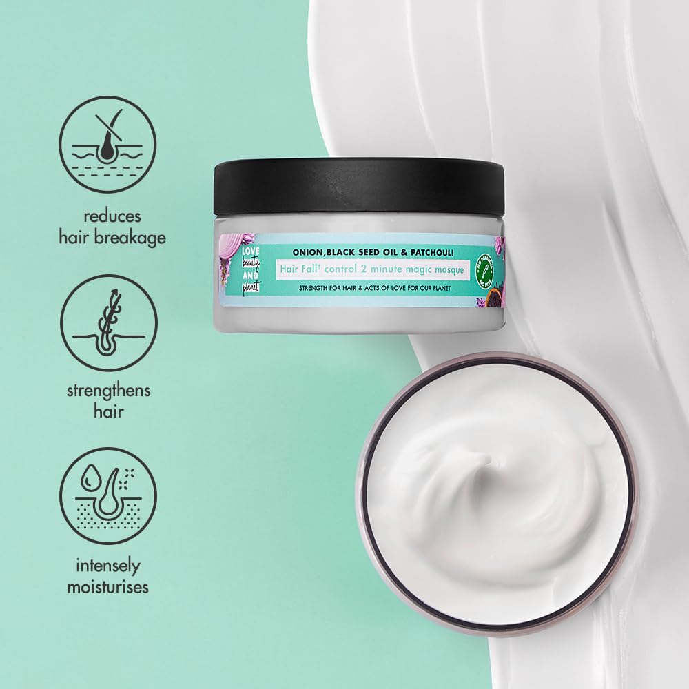 - HAIR FALL CONTROL* HAIR MASK Love Beauty & Planet Onion, Blackseed oil and Patchouli hair mask strengthens hair and nourishes the scalp for no hair fall and healthy, strong mane. *refers to hair fall due to breakage