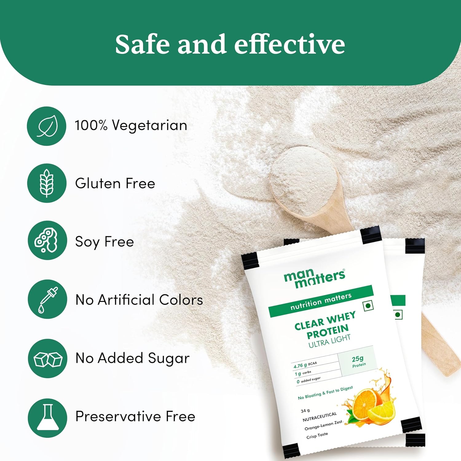- Man Matters Clear Whey Protein Powder (Orange Flavour) | No Added Sugar | For Muscle Support & Recovery | Ultra Light Formulation | 170g (34g x 5 Sachet) | Vegetarian & Gluten Free