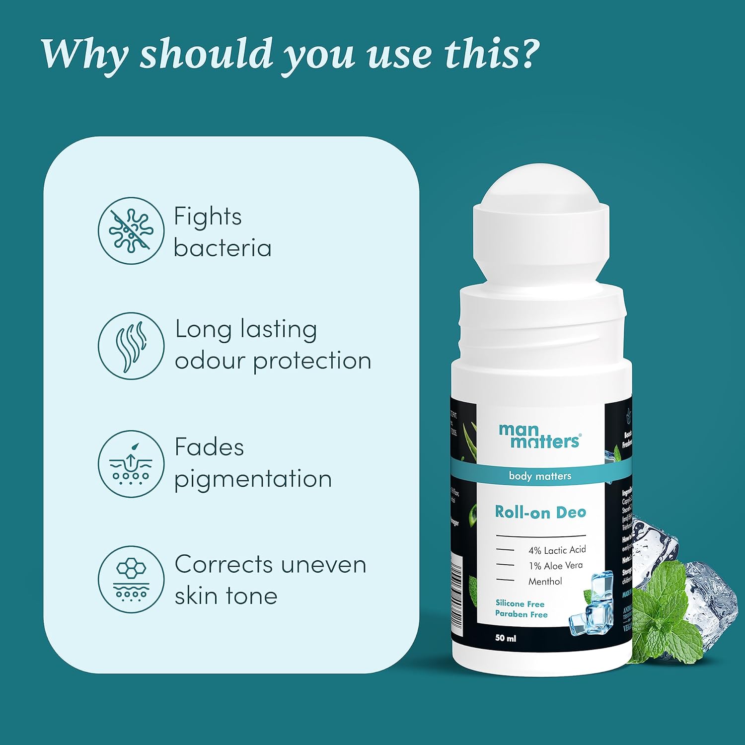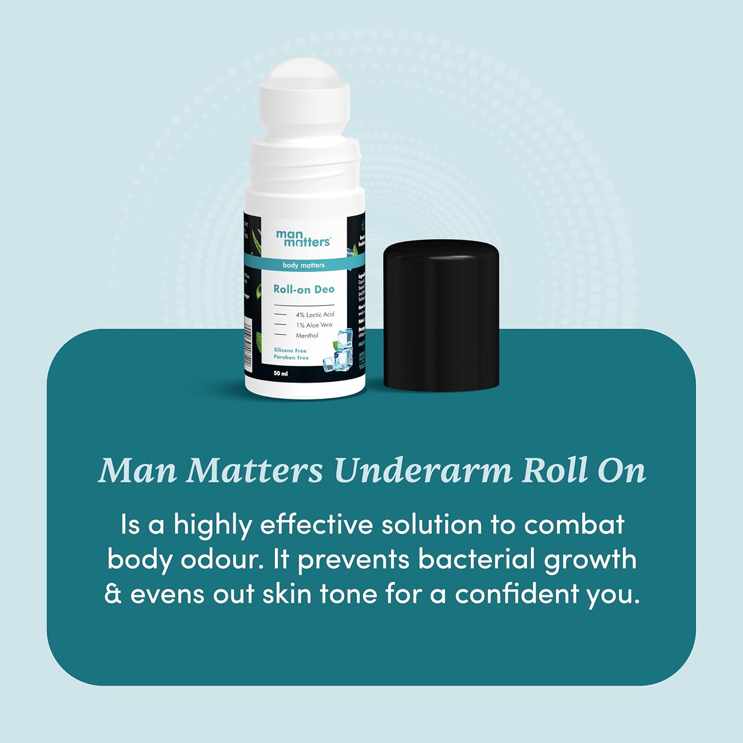 - Man Matters Underarm Deodrant Roll-On 50 Ml | Long Lasting Cooling Freshness, Removes Bad Odour, Brightens Underarms | 4% Lactic Acid, 1% Aloe Vera & Menthol | Aluminium Free