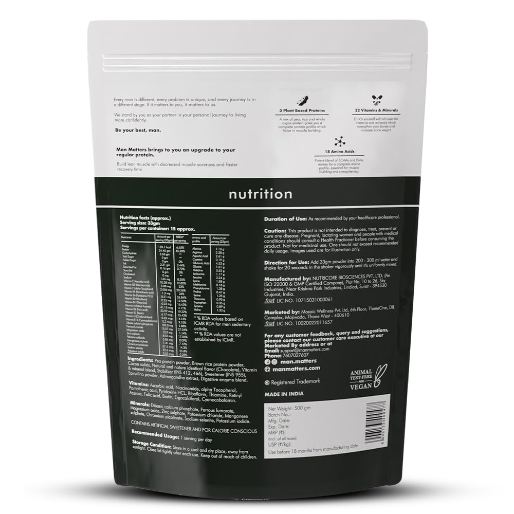 - Fulfill your body's protein requirements with Man Matters VEGAIN Plant Protein Powder. This 100% vegetarian powder gives you 24 grams of protein in each serving through a mix of 4-plant based proteins. This protein shake helps fulfill nutrition, vitamin, and protein needs in your diet.