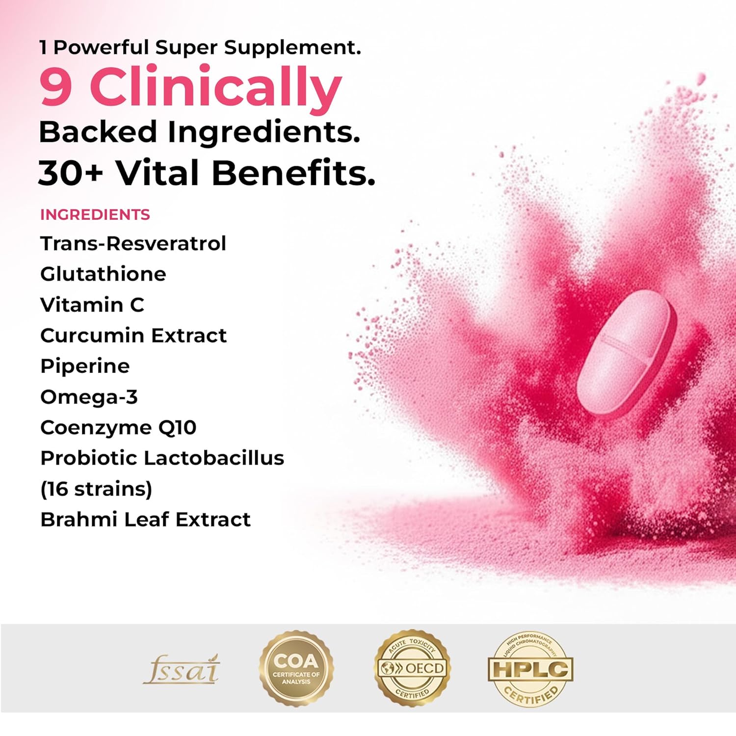 - Science-Backed Ingredients in Therapeutic Doses Each tablet packs 400 mg Resveratrol, 200 mg Glutathione & Curcumin (95%), 16-strain Probiotics, Omega-3 & CoQ10 — to boost cellular energy, skin glow & gut health.