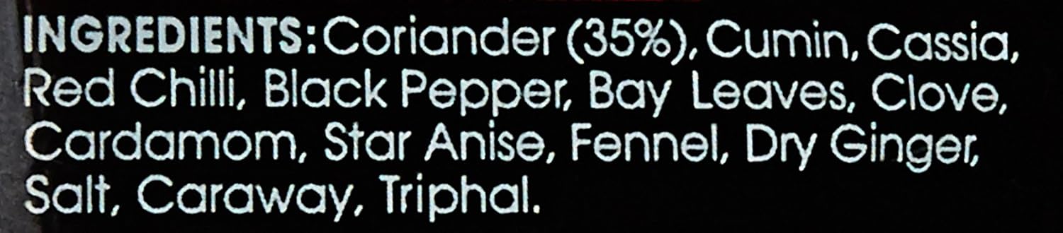 Coriander (34%), Cumin, Cassia, Red Chilli, Black Pepper, Bay Leaves, Clove, Cardamom, Star Anise, Fennel, Dry Ginger, Salt, Caraway, Triphala.