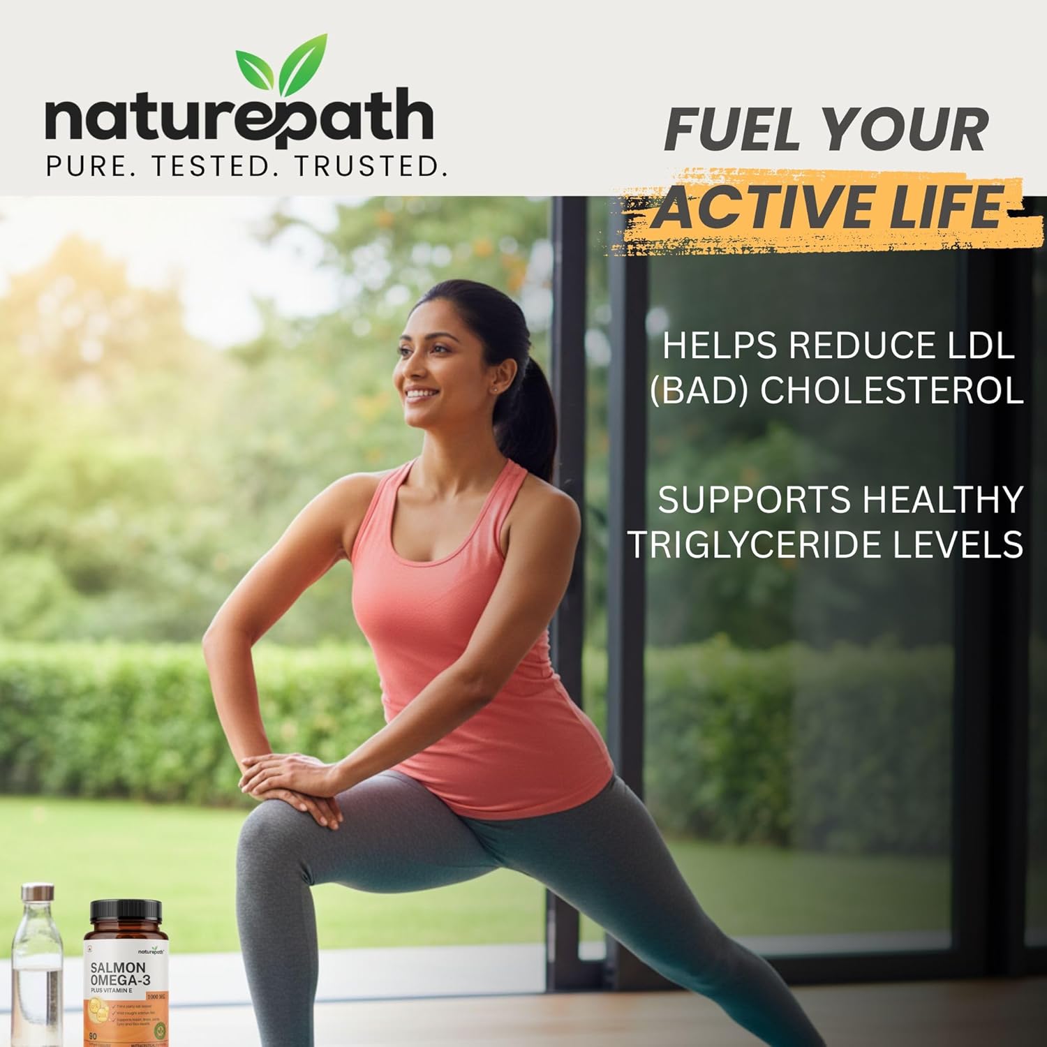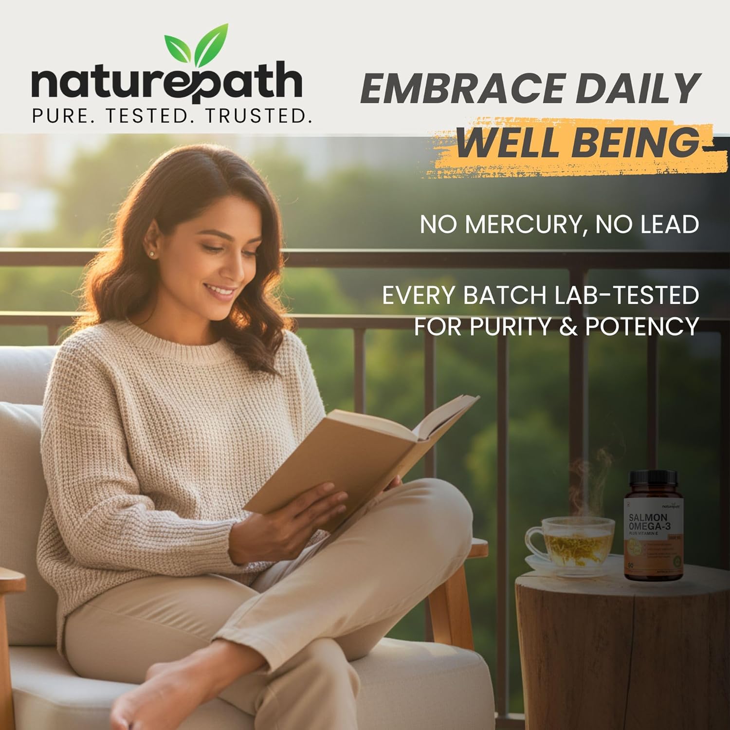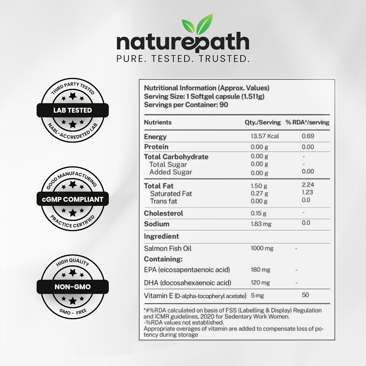 NaturePath Salmon Omega 3 Fish Oil capsules plus Vitamin E - 1000mg - For Men & Women - Supports Heart, Brain, Joints, & skin Health - No Fishy Aftertaste - 3rd Party Lab Tested - 90 Softgels